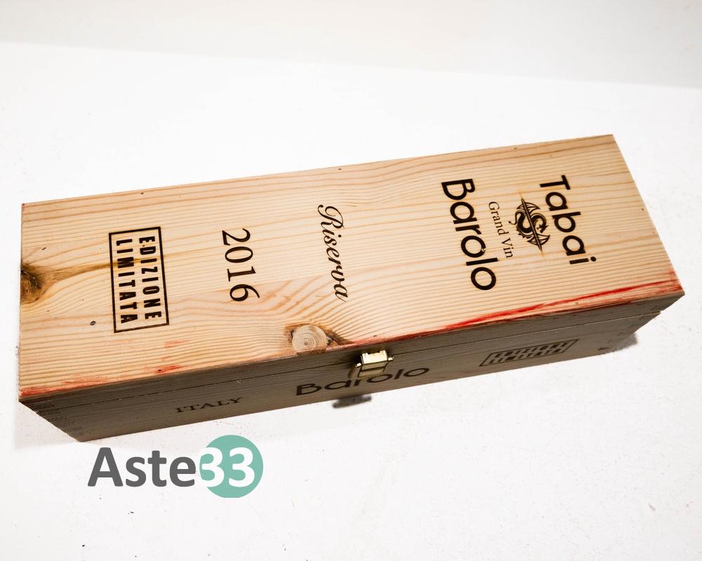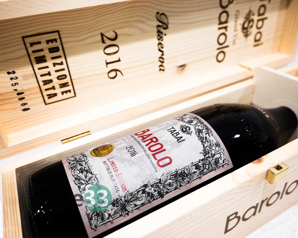 Bottiglia Magnum 1,5L di Barolo Gran Vin Tabai, Riserva 2016 in edizione limitata n. 225-8888, vol.14,5% DOCG. È presente la confezione in legno.