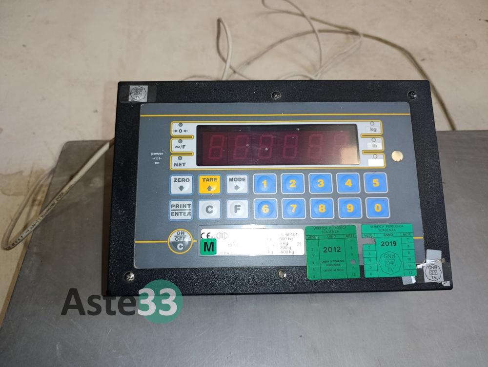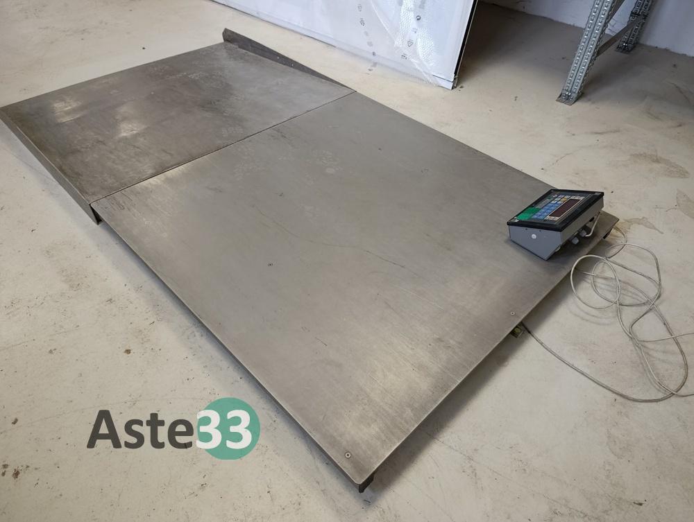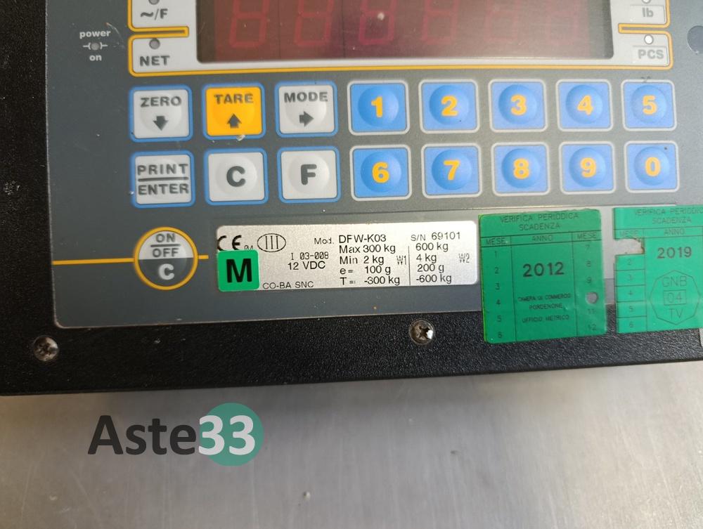 Bilancia alimentare in acciaio inox, portata 600kg, con strumento mod. DFW-K03 s/n 69101, piatto a pavimento con pedana ingresso.