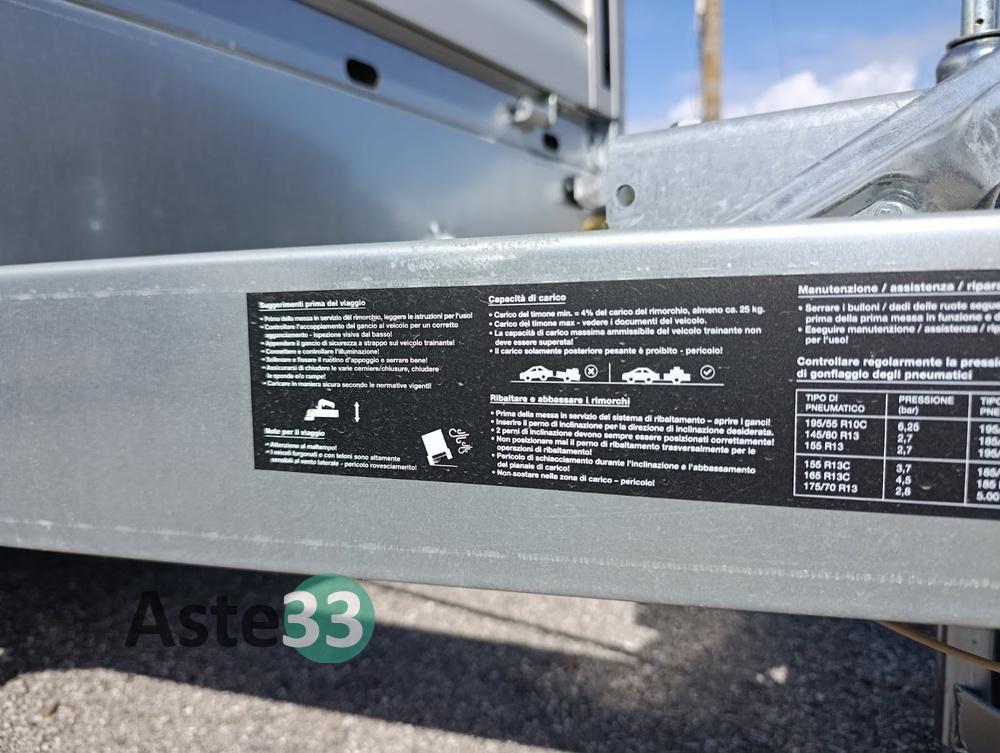Rimorchio NOVATECNO MT 2000 ALU.Massa complessiva kg 750/900/1000; Portata utile 515/640/765; Pneumatici da 13 pollici; N.1 assale; Misura cassone interno 201x151cm.NOTE: L’immatricolazione sarà effettuata presso un’agenzia individuata dal venditore. Le spese di immatricolazione sono a carico dell’aggiudicatario.
