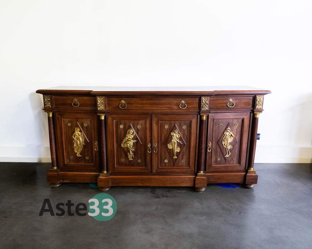 Mobile in legno modello buffet in stile Impero – cassetti a coda di rondine – finimenti in bronzo con allegorie classiche – misura 210x60x100cm – presenta segni d’usura – piano con fenditure