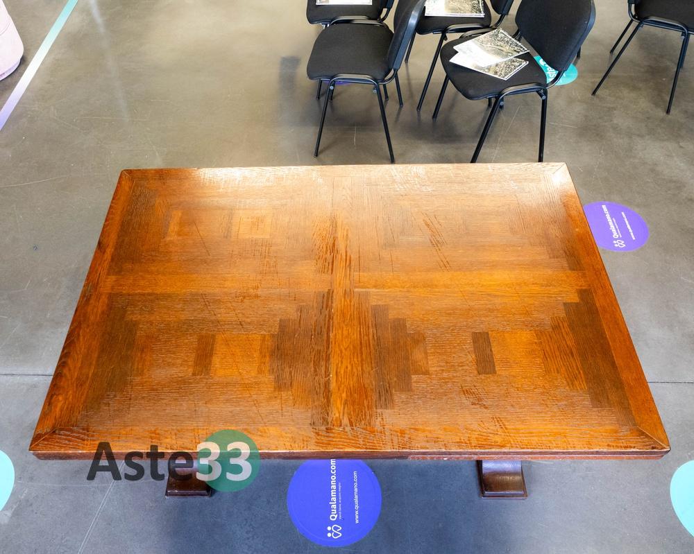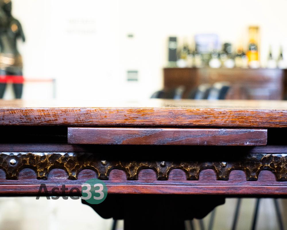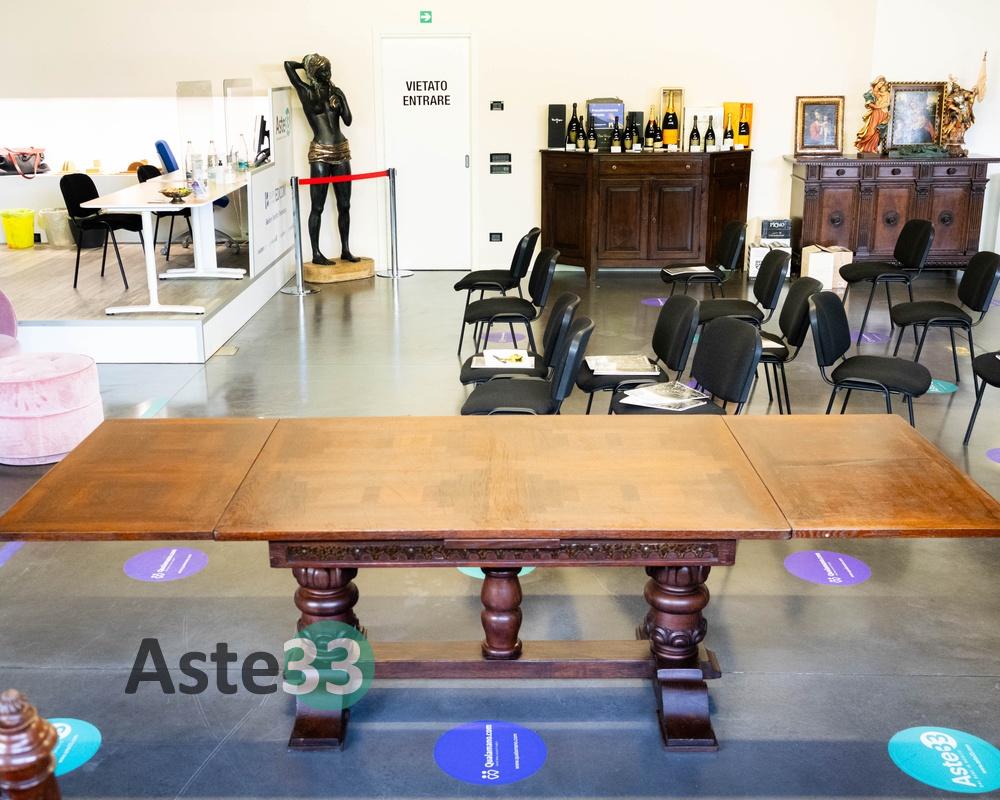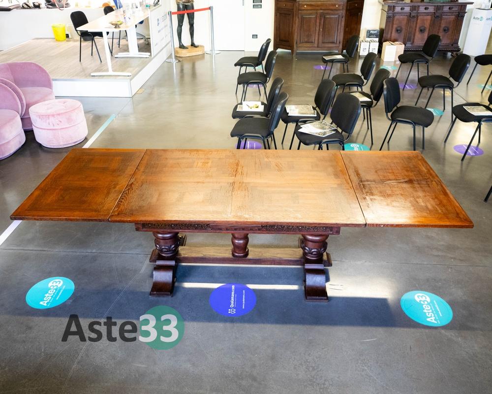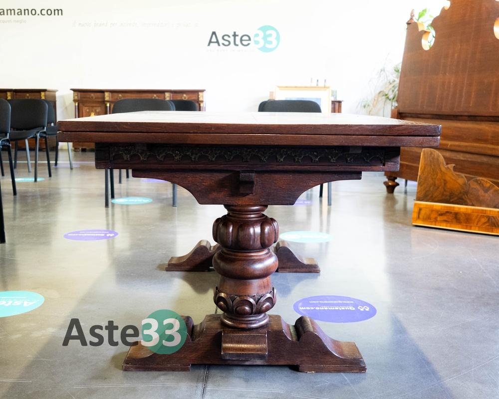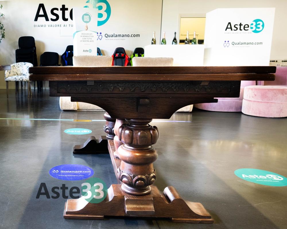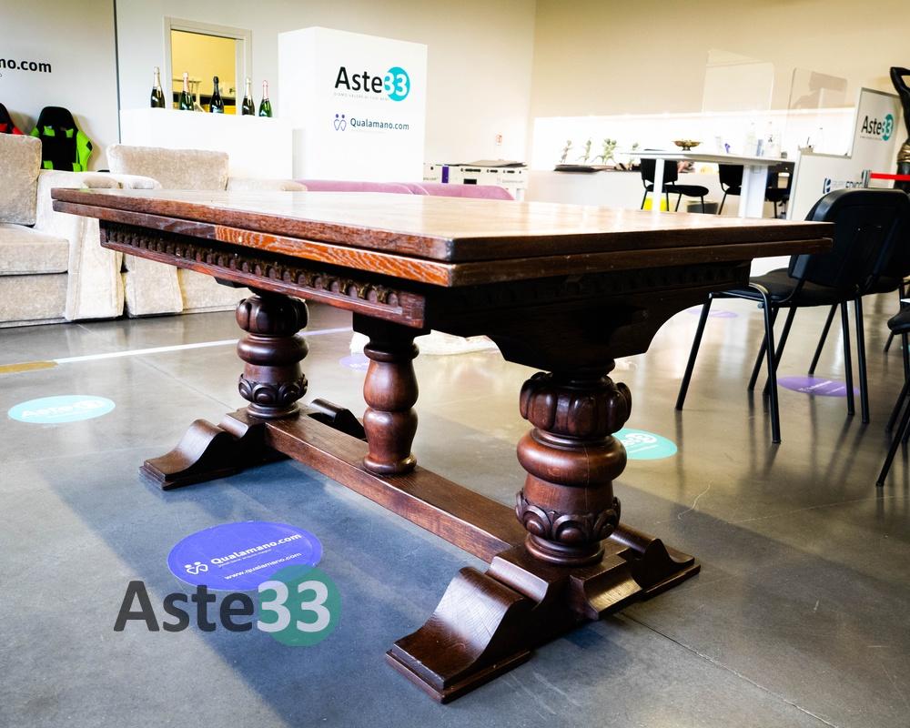Tavolo in legno d’epoca – base a colonne decorate in stile rinascimentale – presenta segni d’usura – misura da chiuso 147x98x75cm – misura da aperto 266x98x75cm