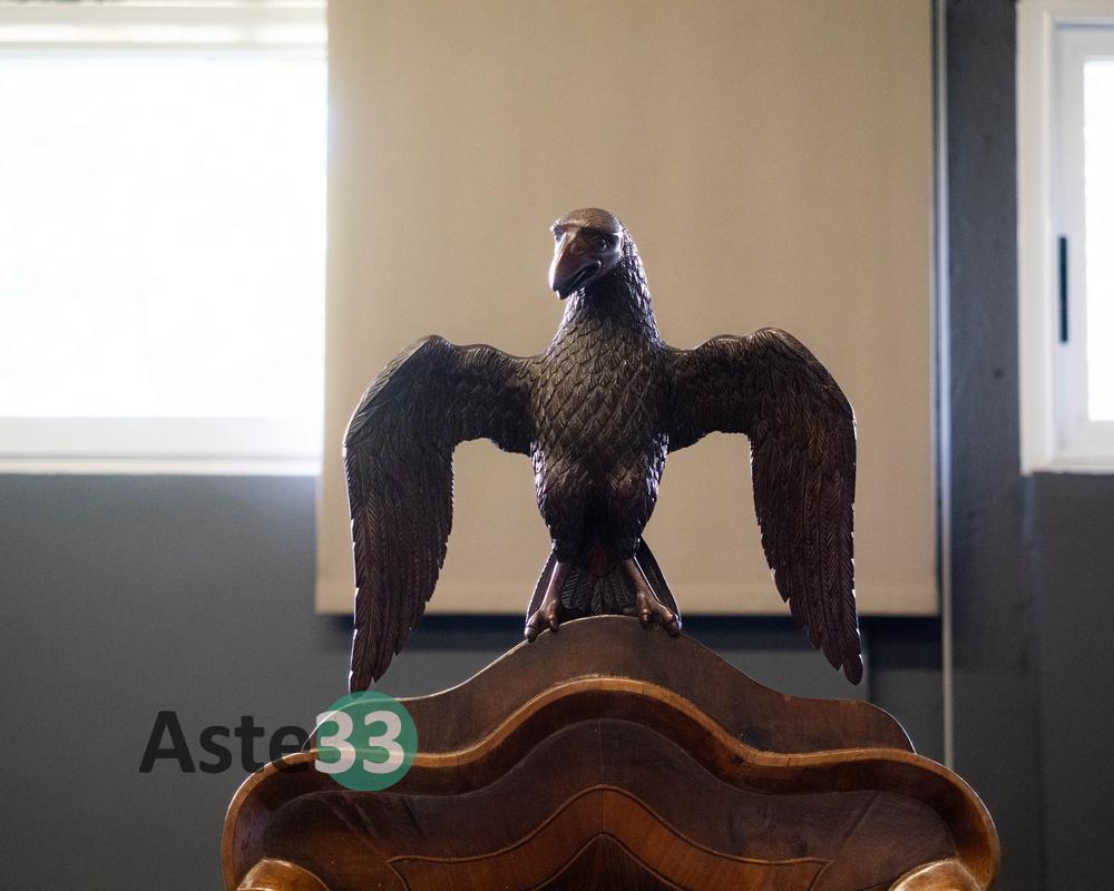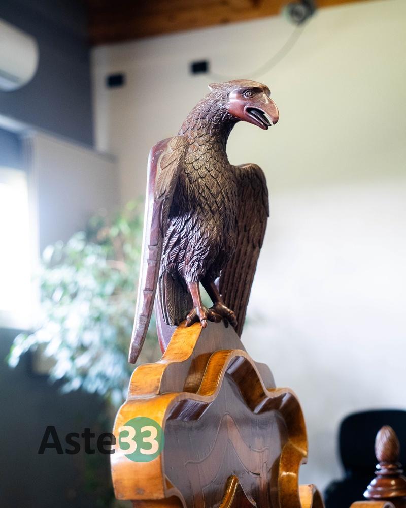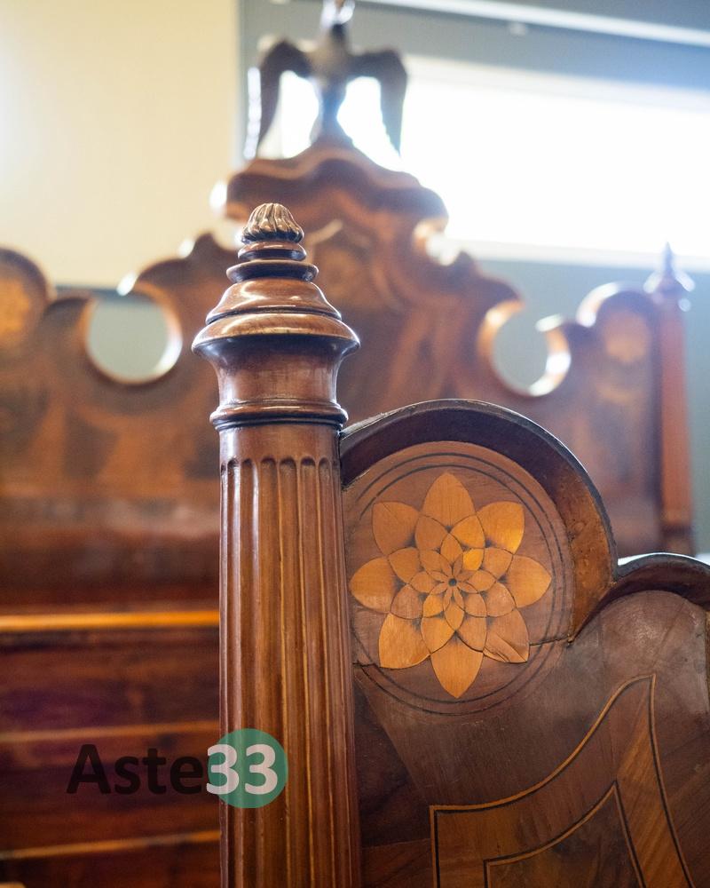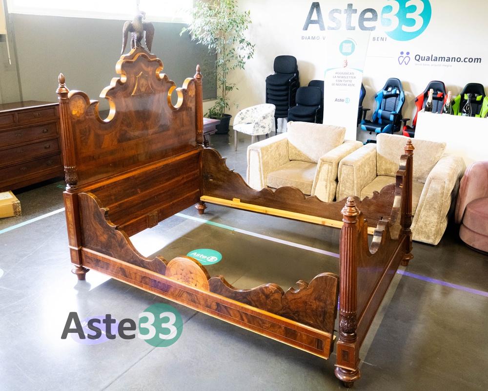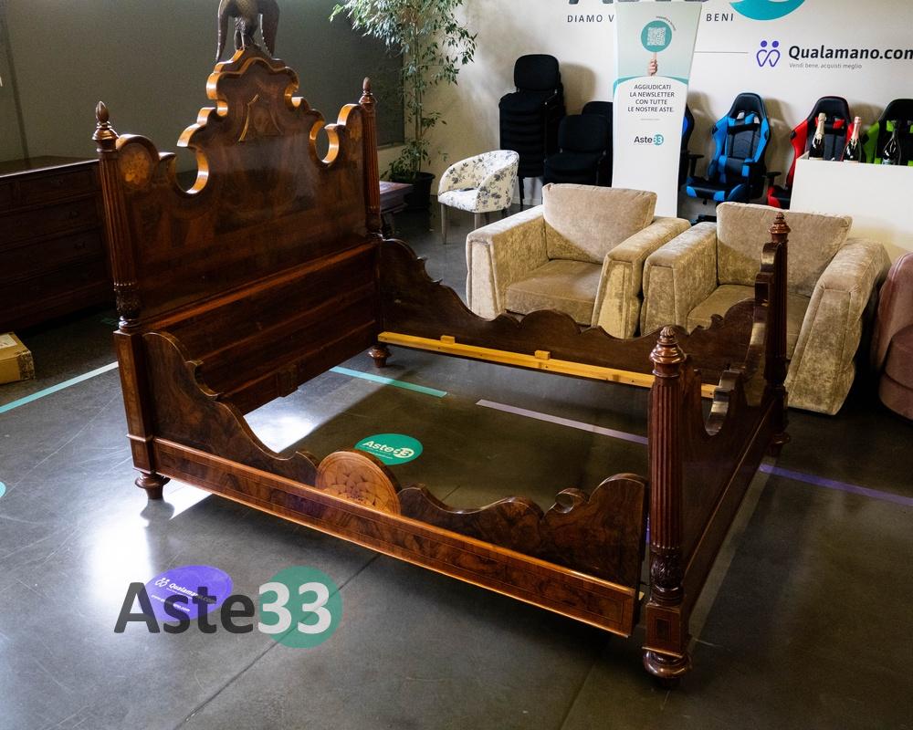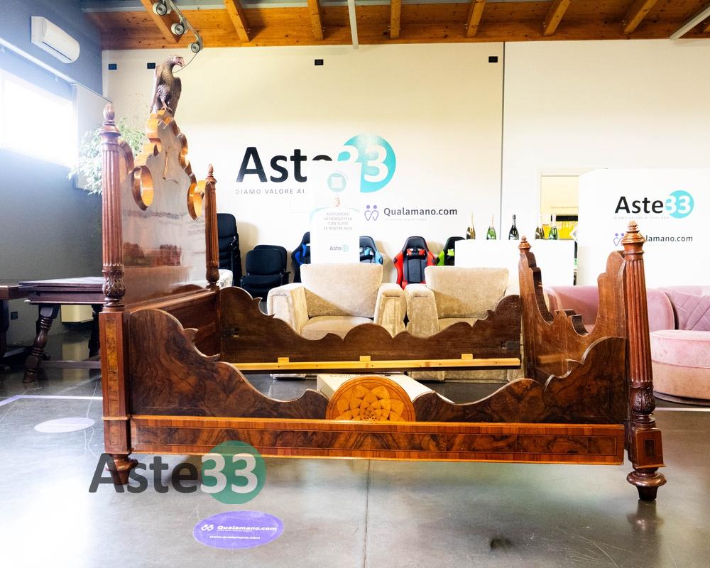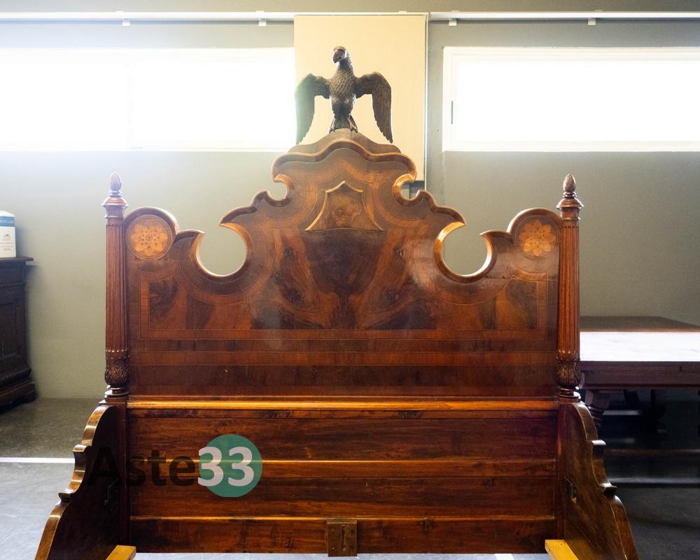 Struttura di letto in stile Impero finemente decorata con intarsi – testiera coronata da aquila in legno intagliata a mano – misura 222x177x76cm – presenta segni d’usura