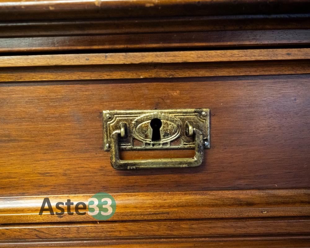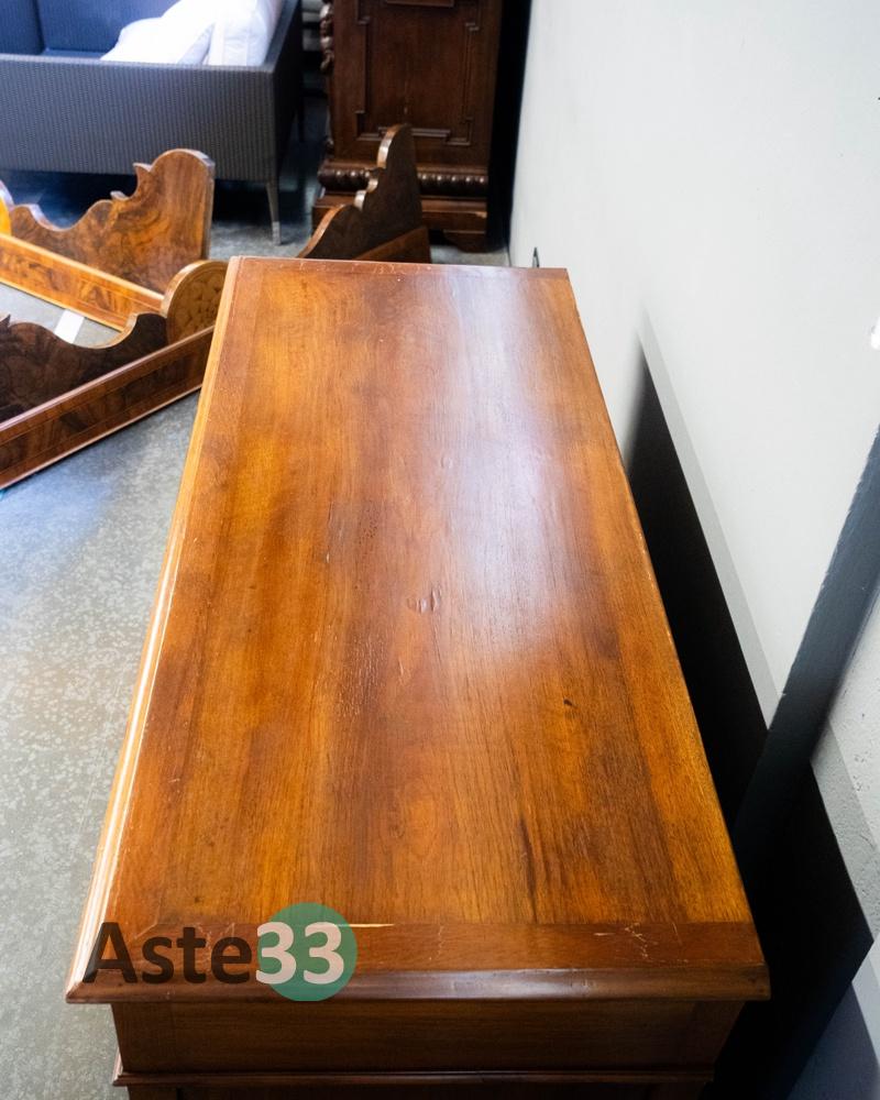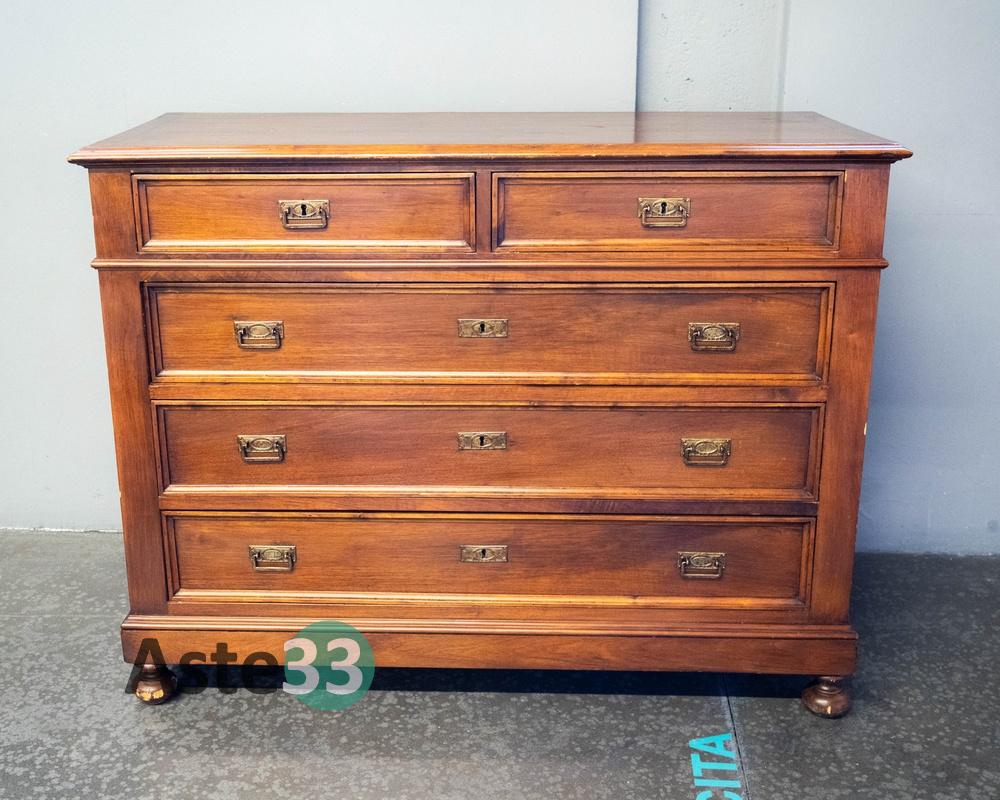 Cassettiera in legno d’epoca – 6 cassetti – ferramenta in ottone stile liberty- piedi a cipolla – misura 135x52x108cm – presenta segni d’usura