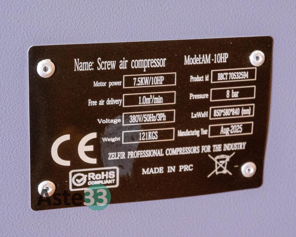 Compressore super silenziato a vite - alimentazione 380 volt - pressione 8 bar - potenza 10 Hp - mai usato – free air delivery un metro cubo al minuto – peso 121Kgs – identificativo del prodotto BBCT70532594