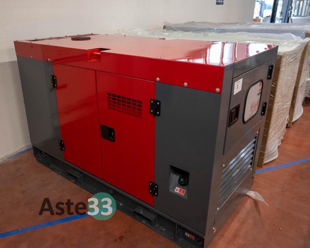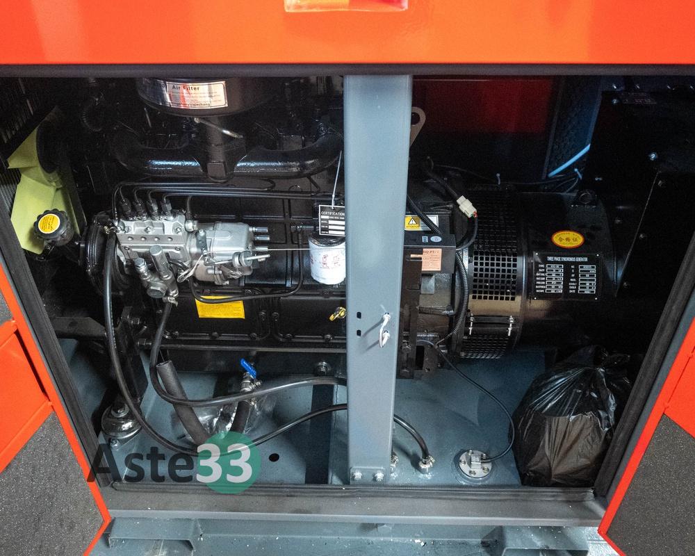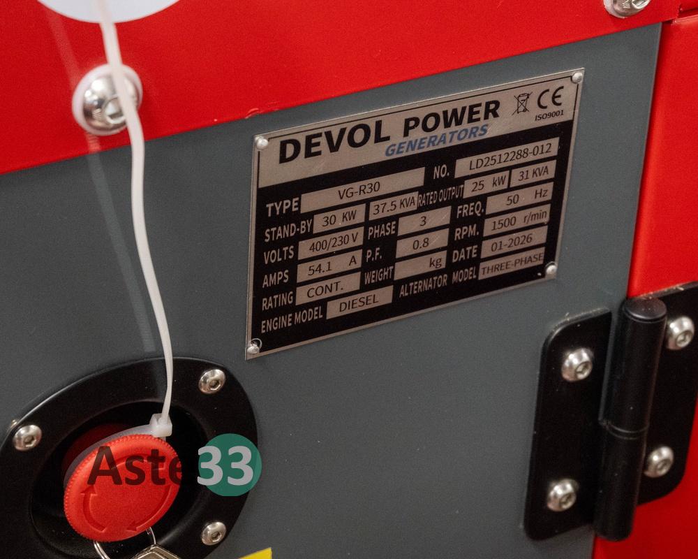 Generatore elettrico DEVOL VG-R30 - super silenziato - accensione elettronica automatica - motore ricardo 4 cilindri raffreddato ad acqua - motore con sistema riduzione consumi - uscite 400/230 Volt - potenza 30 kW-41 – 37,5KVA – colore rosso e grigio - nuovo con 0 ore di attività – numero di serie LD2512288-012