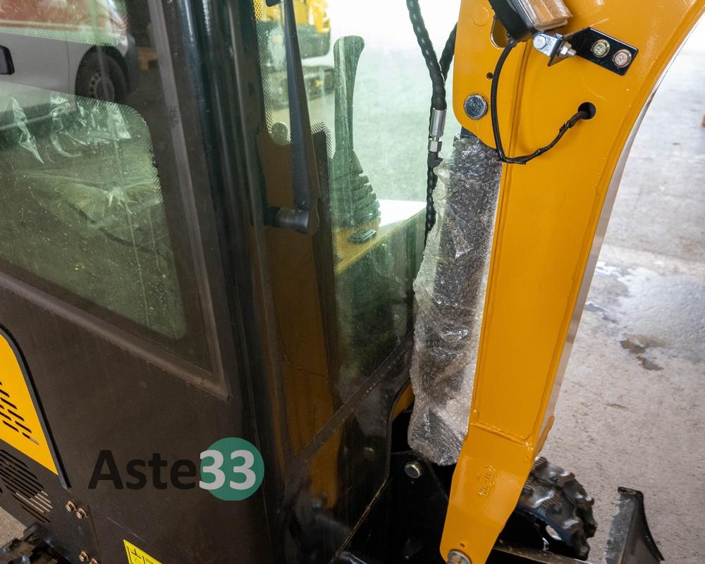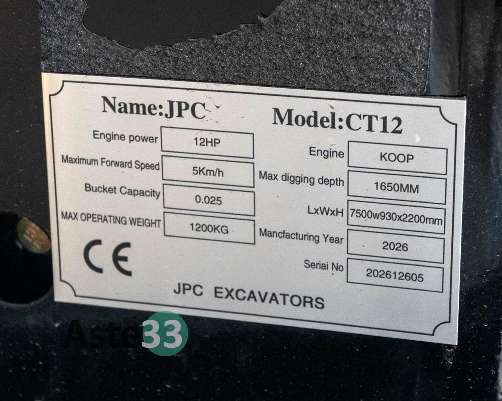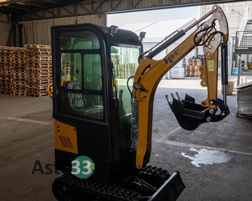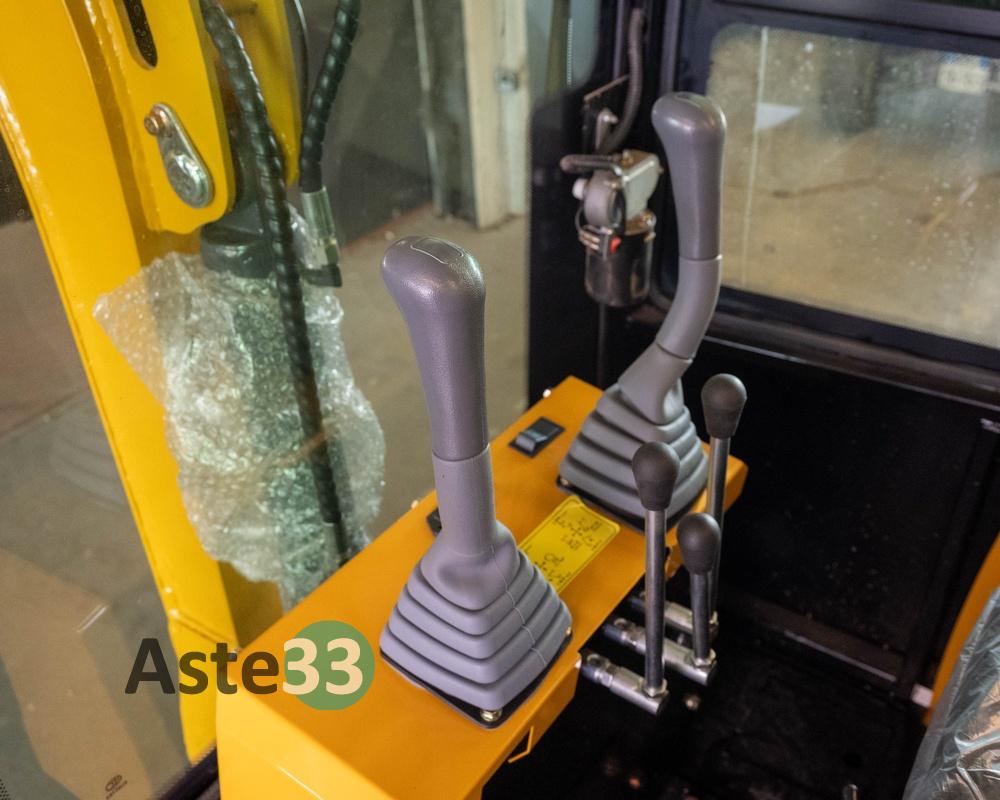 Miniescavatore cingolato con cabina in vetro - completo di benna da scavo - accensione elettronica - cingoli in gomma - ralla rotazione continua 360 gradi - attacco e comando per martellone - mai usato 0 ore – engine power 12HP – velocità massima 5 km/h – max. operating weight 1200kg – max digging deph 1650MM – numero di serie 202612605