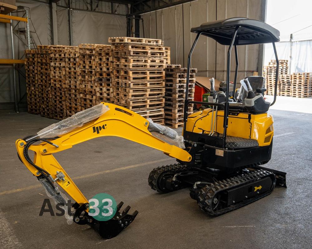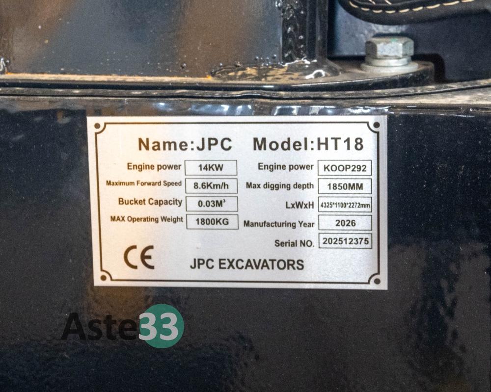 Miniescavatore JPC HT 18, dotato di motore bicilindrico diesel KOOP - joystick e comandi elettrici - dotato di carro allargabile - brandeggio braccio - impianto idraulico per martellone - nuovo con 0 ore di attività – peso 1800kg – massima velocità 8,6Km/h – max digging deph 1850MM – numero di serie 202512375