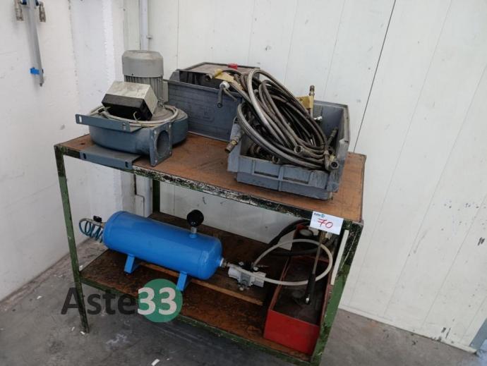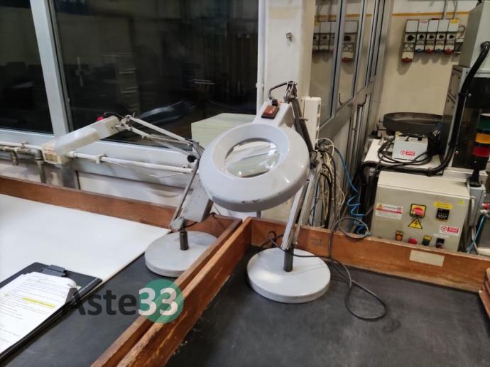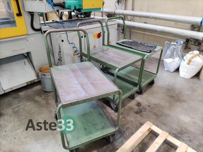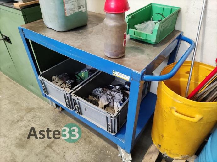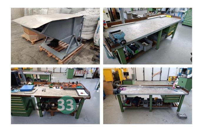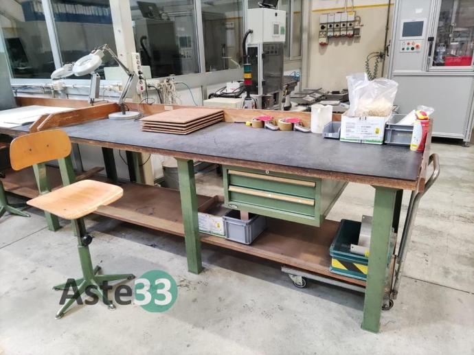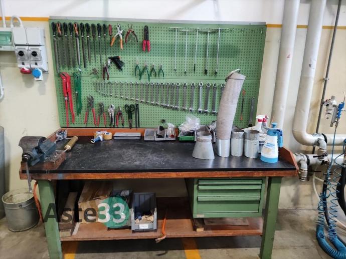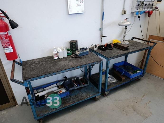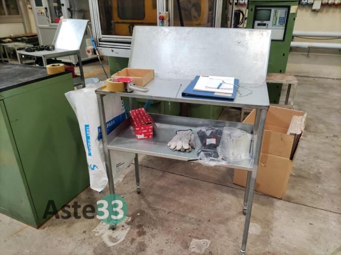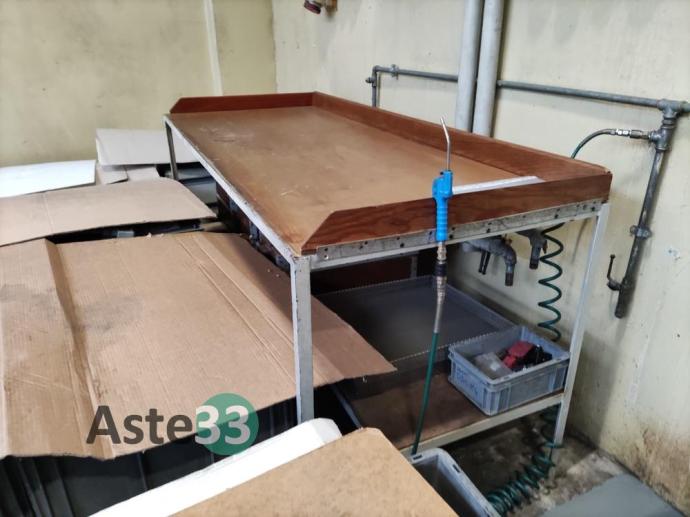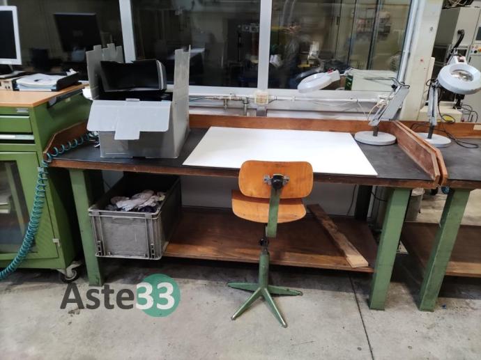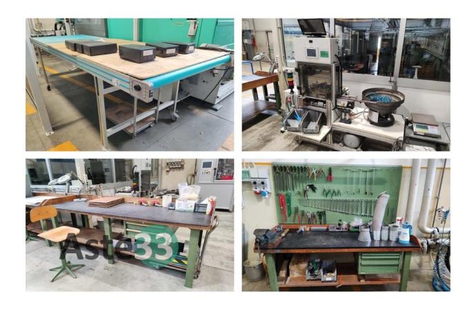 Arredamento per zona produzione composto da banchi, mobili, carrelli, nastro trasportatore ed attrezzature in sorte