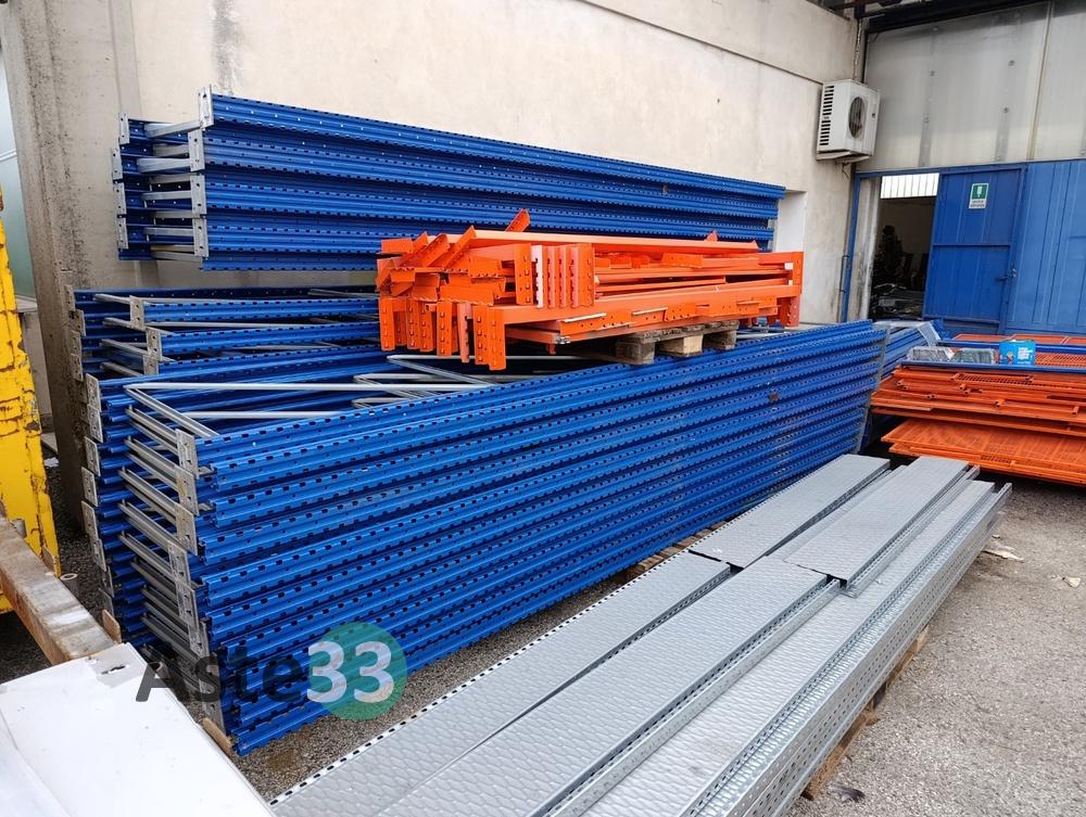 Soppalco (smontato) metallico MODULBLOCK composto da: 40 spalle altezza 480cm circa, lunghezza circa 14mt x10 e n. 2 scaffalature metallica porta pallet a 4 colonne e 24 traversi (dimensione circa 840x110x478).