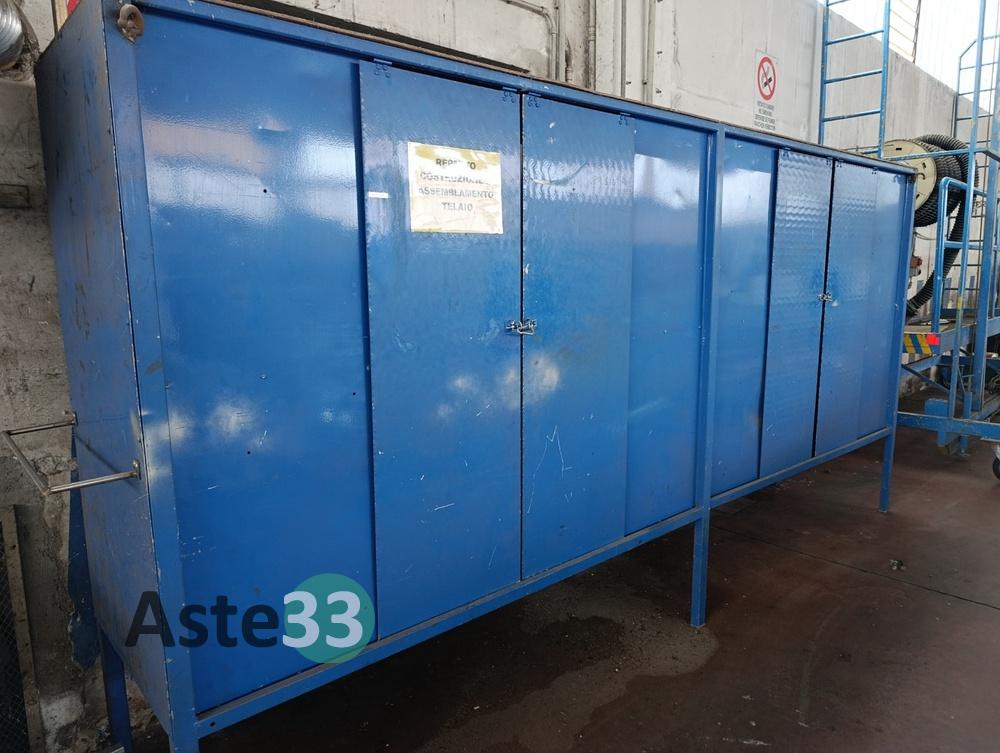 Scaffale metallico autocostruito, con ante scorrevoli contenente 20 contenitori per minuteria e vari particolari metallici;