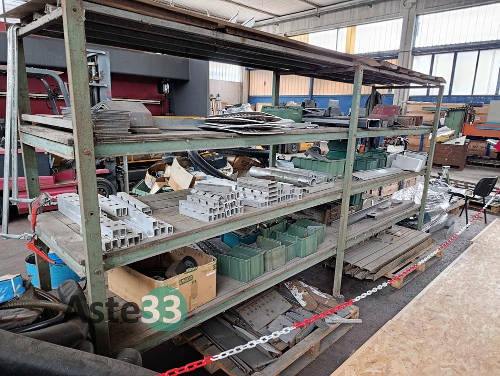 Scaffale metallico leggero a 5 ripiani contenente: ritagli di tubazione, piastrine metalliche e semilavorati metallici;