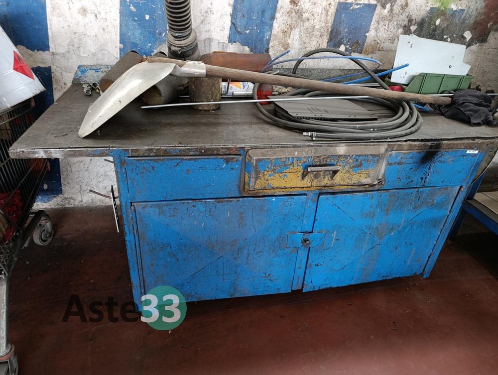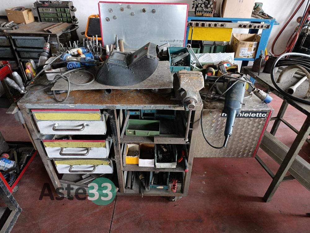 Banco metallico su ruote con morsa, cassetto, 2 vani e 1 anta;