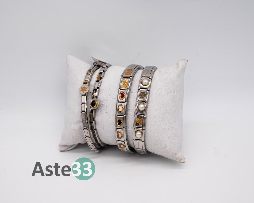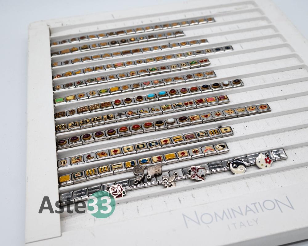 N.14 bracciali in metallo componibili Nomination Italy con maglie decorative, raffiguranti motivi colorati.N.2 bracciali in metallo componibili Nomination Italy con ciondoli colorati.N.14 bracciali modulari in acciaio inox, composti esclusivamente da maglie neutre senza decorazioni.N. 3 bracciali elastici in acciaio con applicazioni a forma di farfalla in diverse finiture