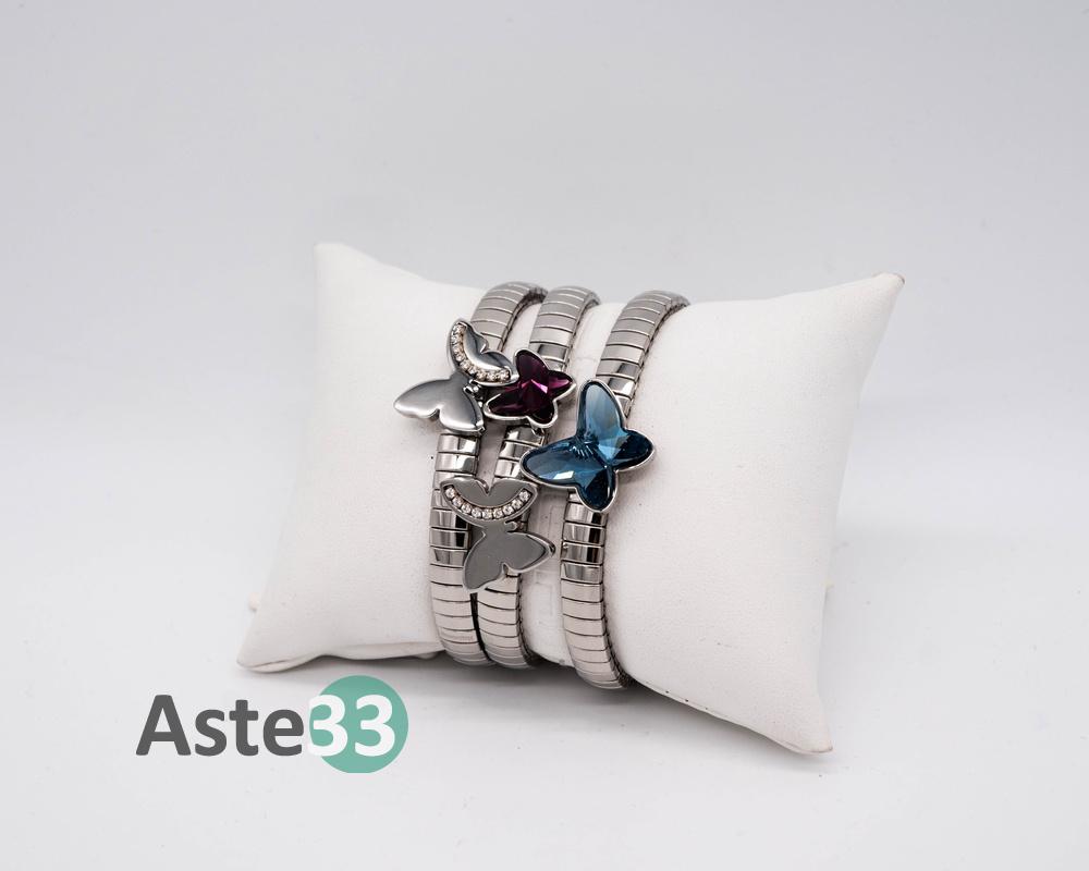 N. 3 bracciali elastici in acciaio con applicazioni a forma di farfalla in diverse finiture