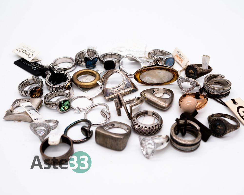 N.20 anelli in argento 925 in stile moderno con motivi geometrici, classici e di design.N.2 anelli “Rebecca” in metallo con brillantiniN.6 anelli snodati in metallo con pietraN.4 braccialetti in argento 925Collana in argento 925 con inserti rosa