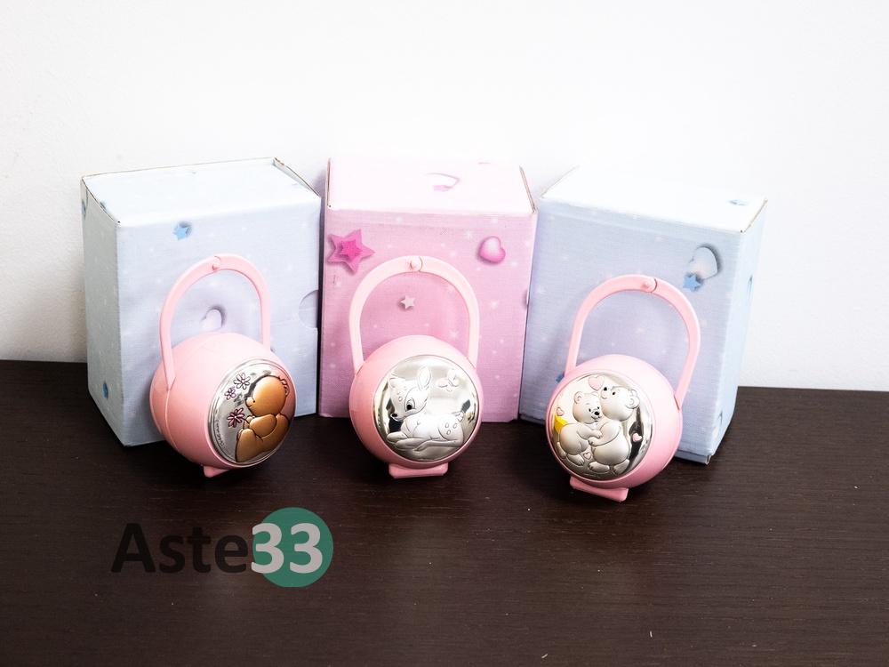 3 porta ciuccio lamina argento con animali7 cornici in sorte lamina argento per bambiniOrologio da parete con orsettiCarillon giostra cavalli in legno e lamina argentoSalvadanaio a forma di porcellino – argentato2 bomboniereCofanetto Disney con album dei ricordi e cornice con DumboAlbum dei ricordi