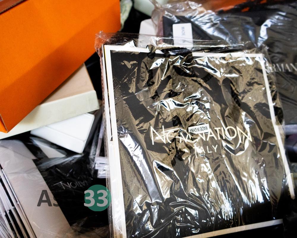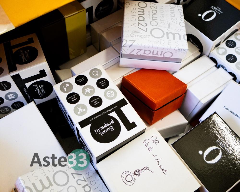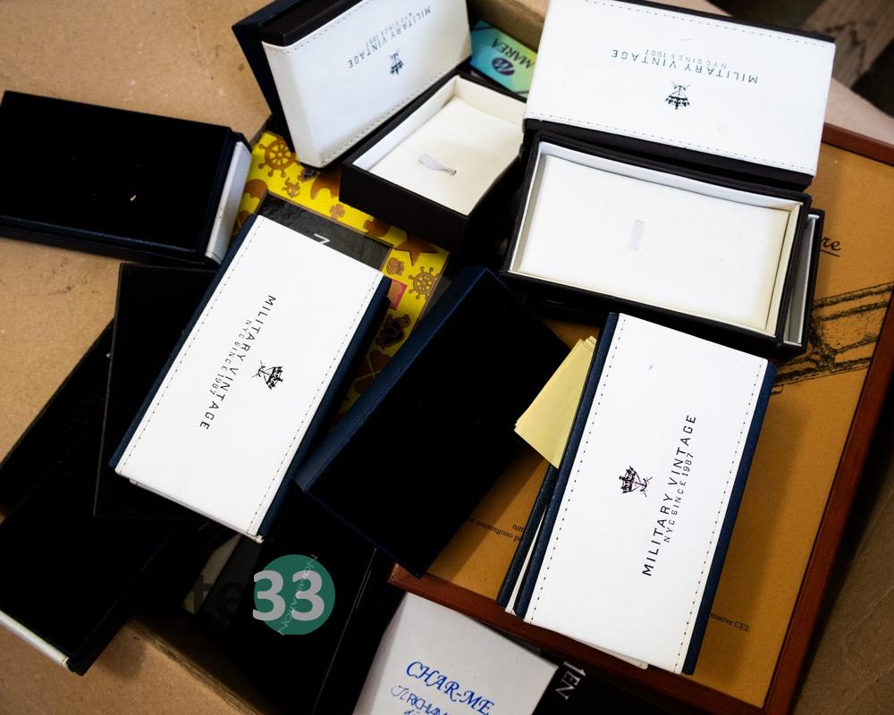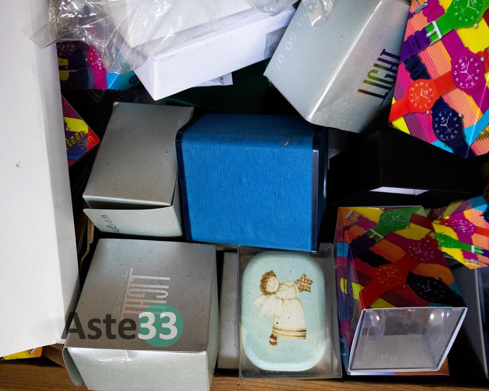 Assortimento di: scatole per gioielli, scatole per orologi, confezioni regalo per gioielleria, sacchetti di carta, plateau per gioielleria – misure, fantasie, brand in sorte.