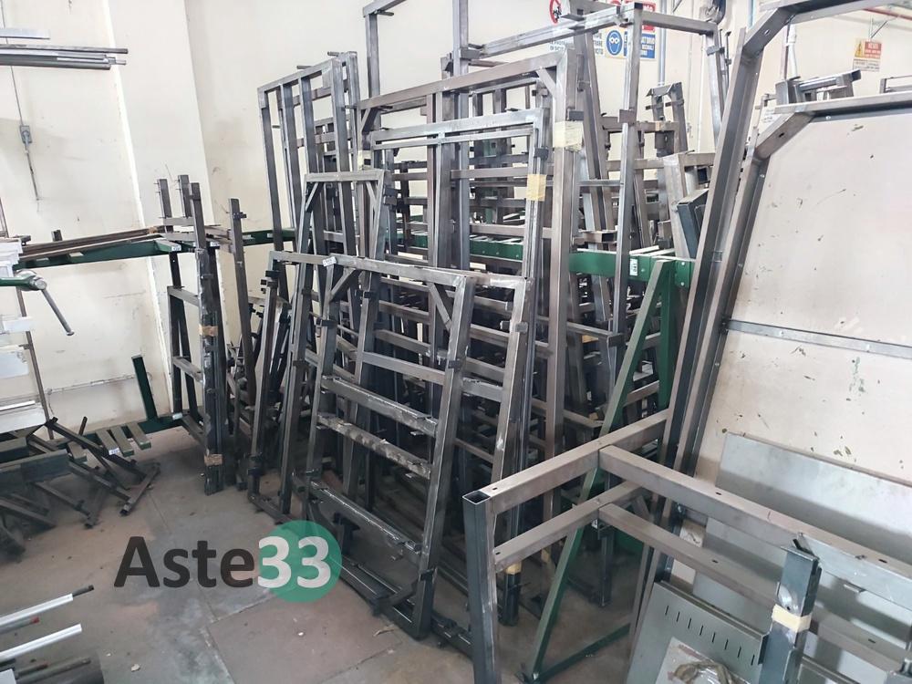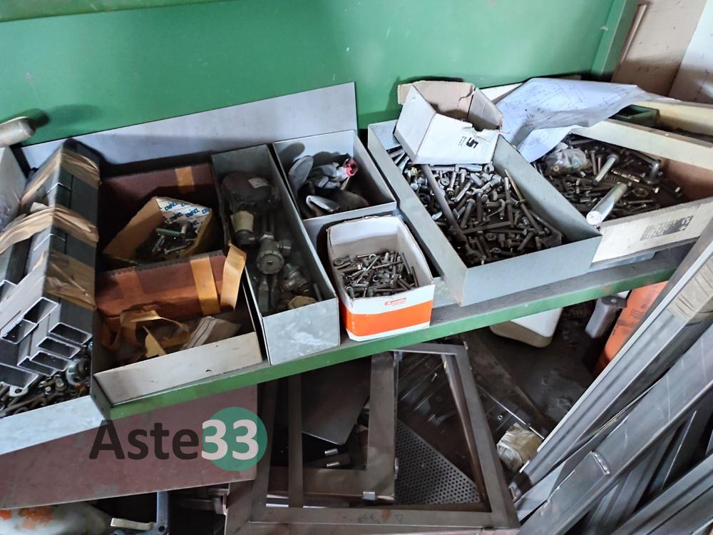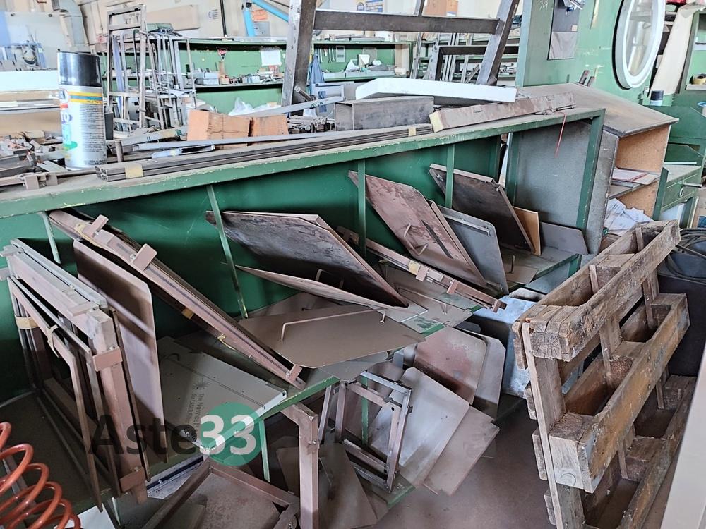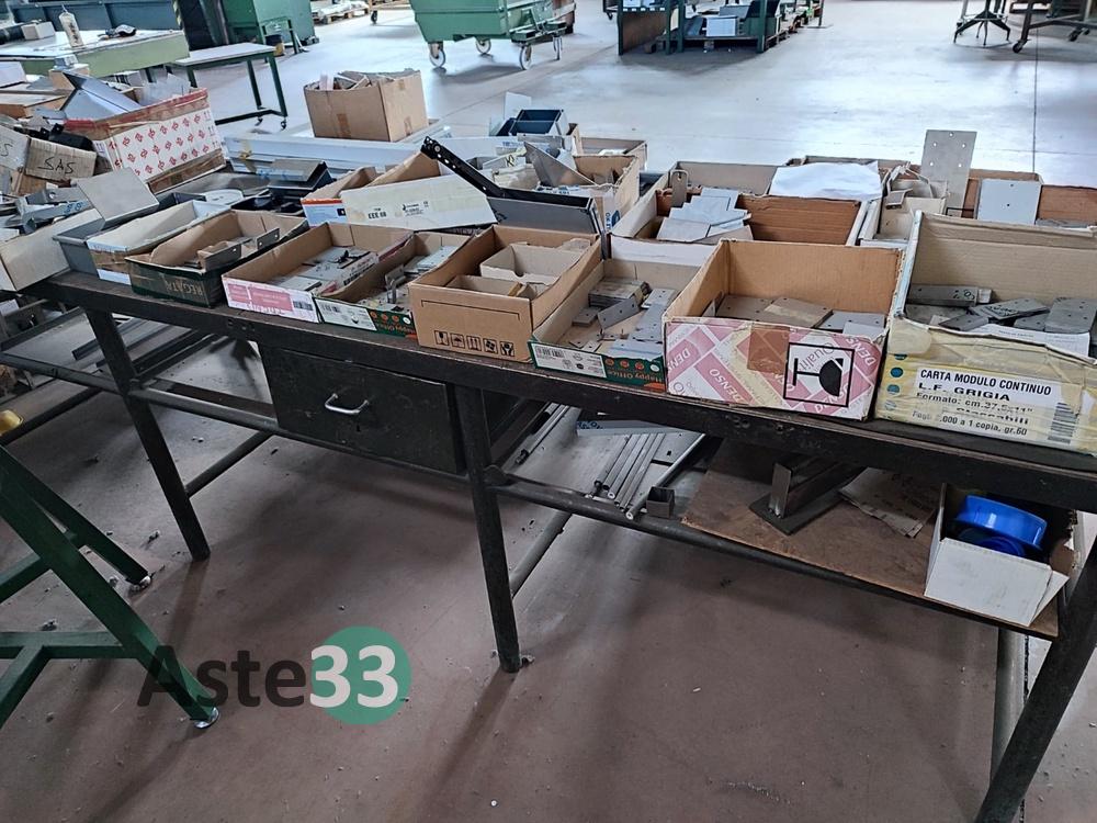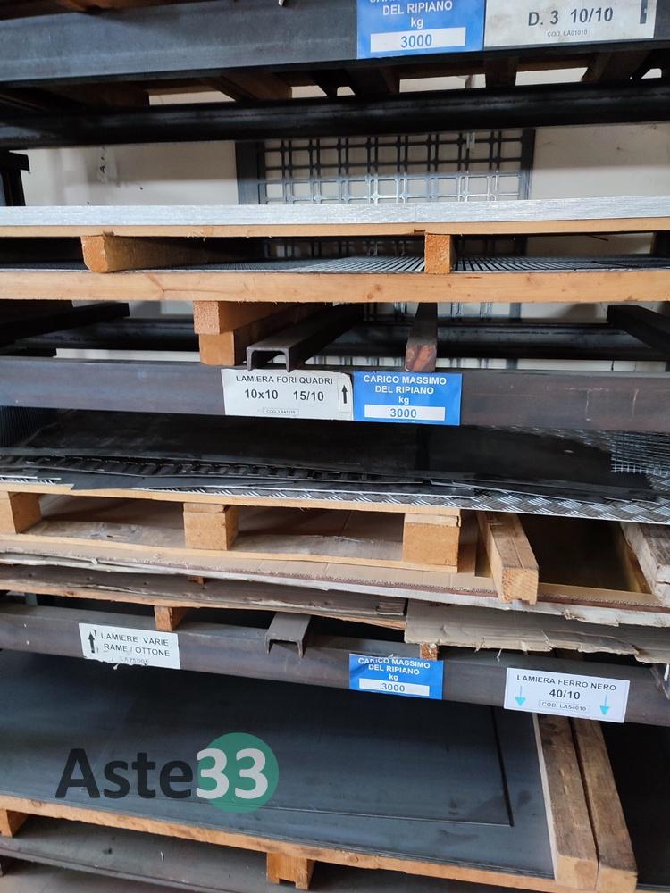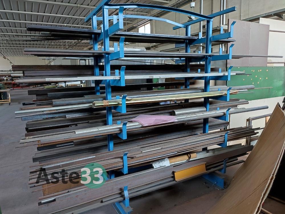 Bancali contenenti materia prima, lamierati, semilavorati metallici, banchi da lavoro, scaffalature, cantilever e materiale in sorte
