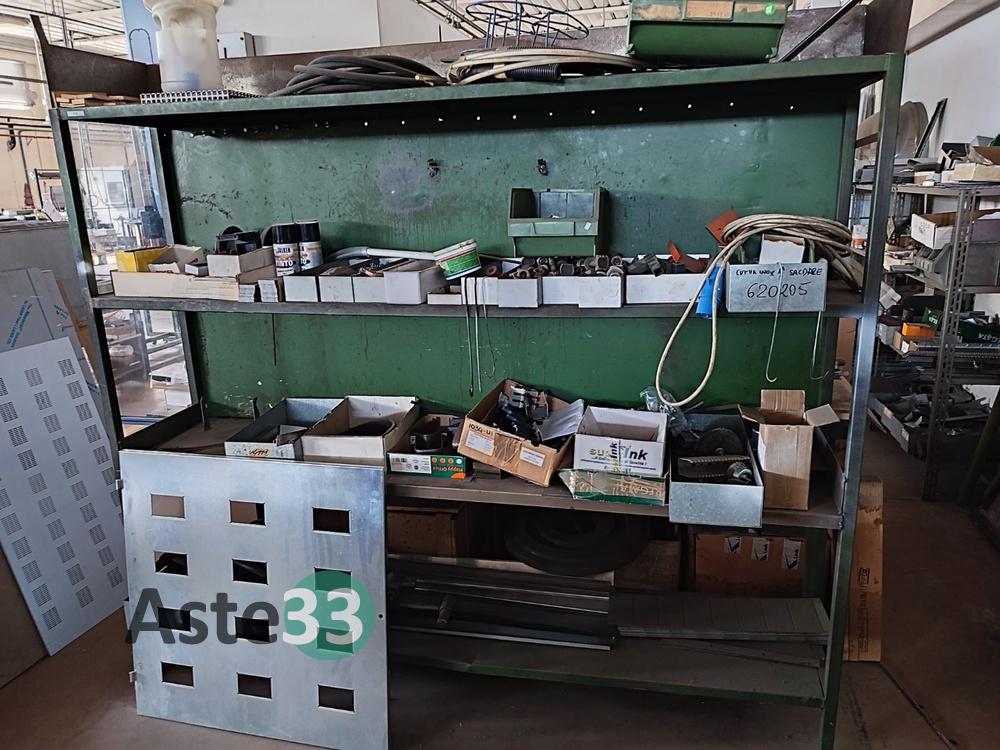 Scaffalatura metallica leggera color verde, contenente vario materiale metallico;