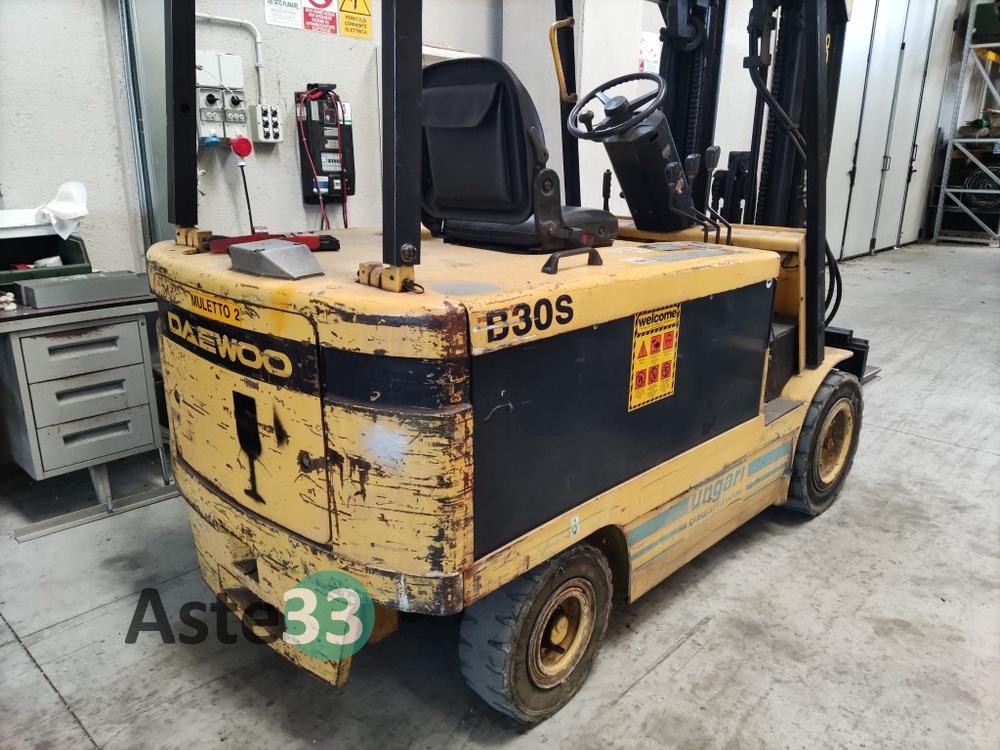 Carrello elevatore elettrico DAEWOO B30S-2, n. serie BD-00059, anno 1998, portata nominale 3000 kg con carica batterie ZIVAN.