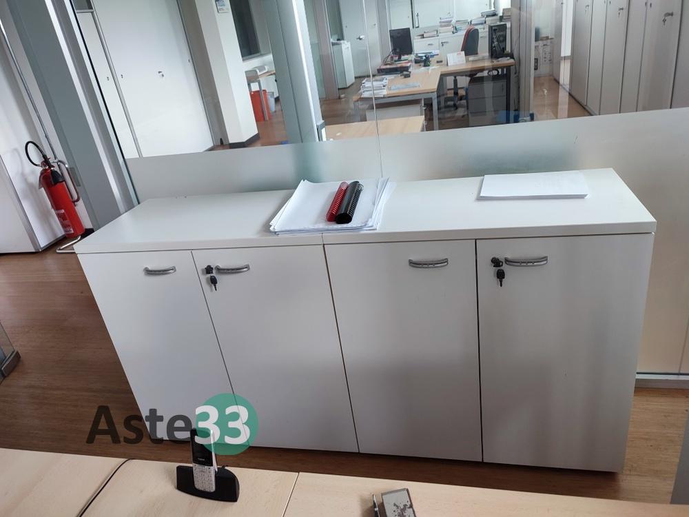 Scrivania ad elle con struttura metallica e piano in laminato dimensioni di circa cm. 180x80 e 60x60;N.2 monitor, tastiera, mouse e pc SI computer Activa Work;Telefono SIEMENS EUROSET 5015;Cordless GIGASET;Cassettiera con 3 cassetti;Appendiabiti a colonna;Carta geografica;N.2 mobili bassi con 2 ante;Mobile alto con 2 ante scorrevoli;Mobile basso a 4...