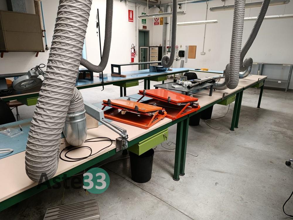 N.29 tavoli da lavoro, computer, stampa etichette e scaffalature