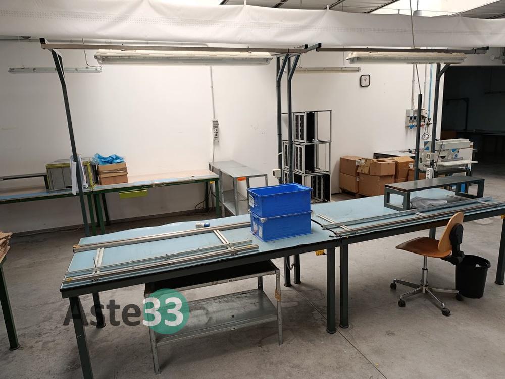 N.2 tavoli da lavoro con supporto per lampada a neon, dimensioni 200x100cm;