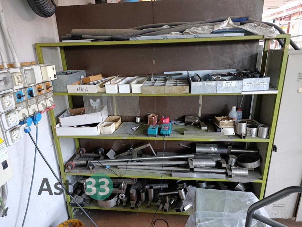 Scaffale metallico con 5 ripiani, dimensioni 200x45cm x h.190cm contenente dime e ritagli di tubo metallico;
