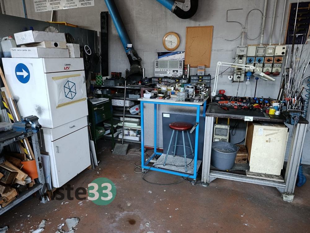 N.2 banchi da lavoro con morsa, carrelli, scaffale metallico, attrezzatura in sorte, piega tubi manuali