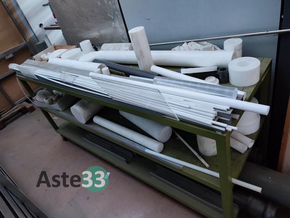 Scaffale metallico a più scomparti, dimensioni 300x30cm x h.162cm, contenente tubazioni in metallo, pvc e teflon;