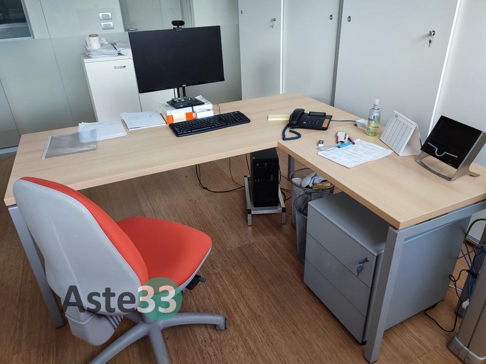 Mobiletto basso con 2 ante;N.2 mobili libreria con 2 ante scorrevoli;Scrivania ad elle con struttura metallica e piano in laminato;Poltroncina su ruote;N.2 cestini;Pc SI computer Activa Work, con monitor, tastiera e webcam;Telefono SIEMENS;Video ELVOX per videocitofono;Mobile basso con 4 ante;Sedia;Mobile basso con 2 ante.