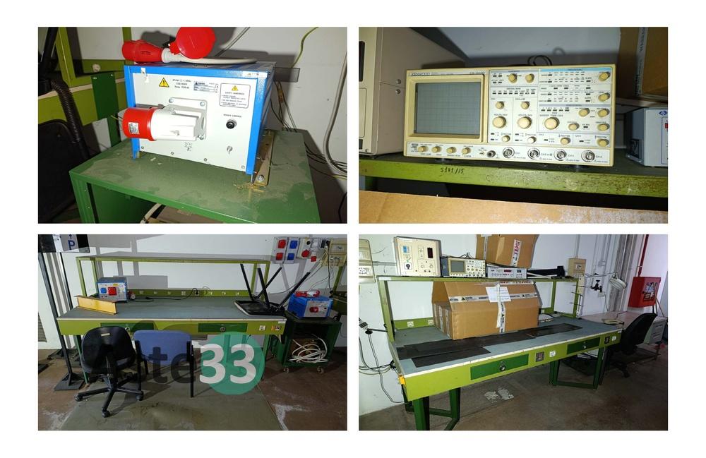N.5 supporti in legno artigianali;N.2 banchi da lavoro con alzata 200x100cm;N.4 tra poltroncine e sedie;N.2 alimentatori PMM L3-32;Trasformatore completo di carrello;Oscilloscopio KENWOOD CS 6030;Unità di misurazione IV 9/EV;Strumentazione elettronica obsoleta;Scatolone con valigetta;Cattedra con cassettiera;Lampada con lente;Telefono.