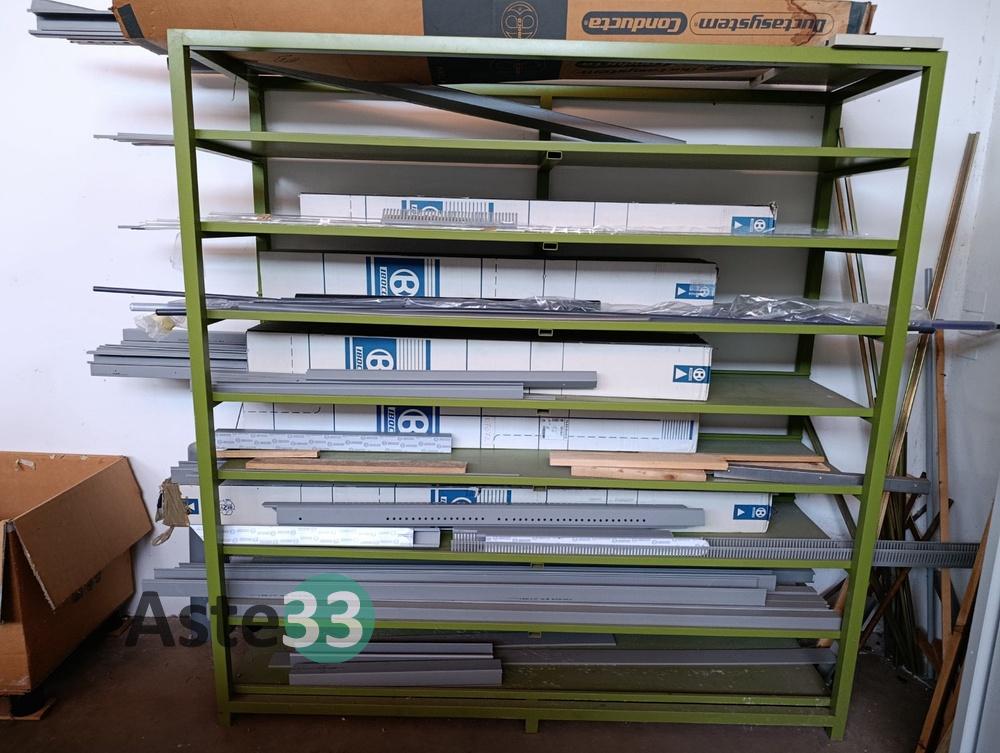 Scaffale metallico con 9 ripiani, dimensioni 200x55cm x h.203cm, contenente canaline e tubi impianti elettrici sopra traccia;