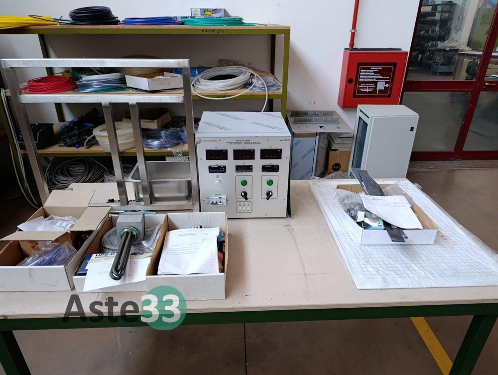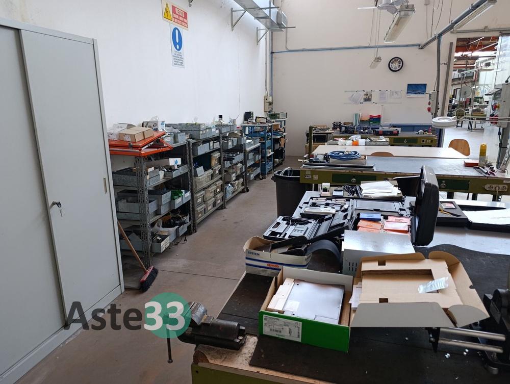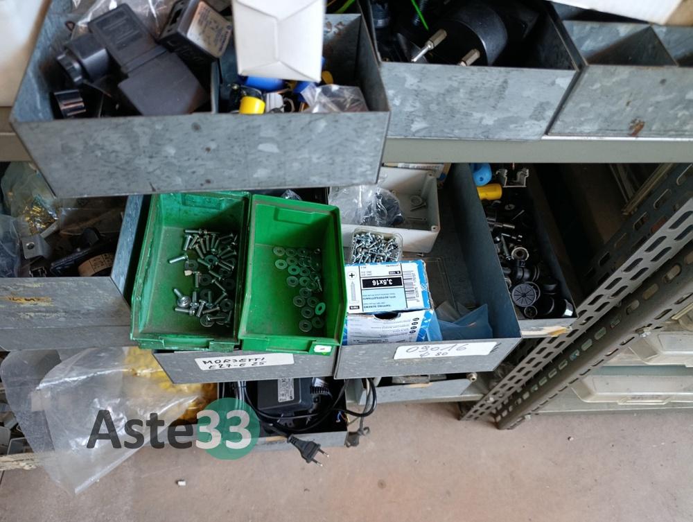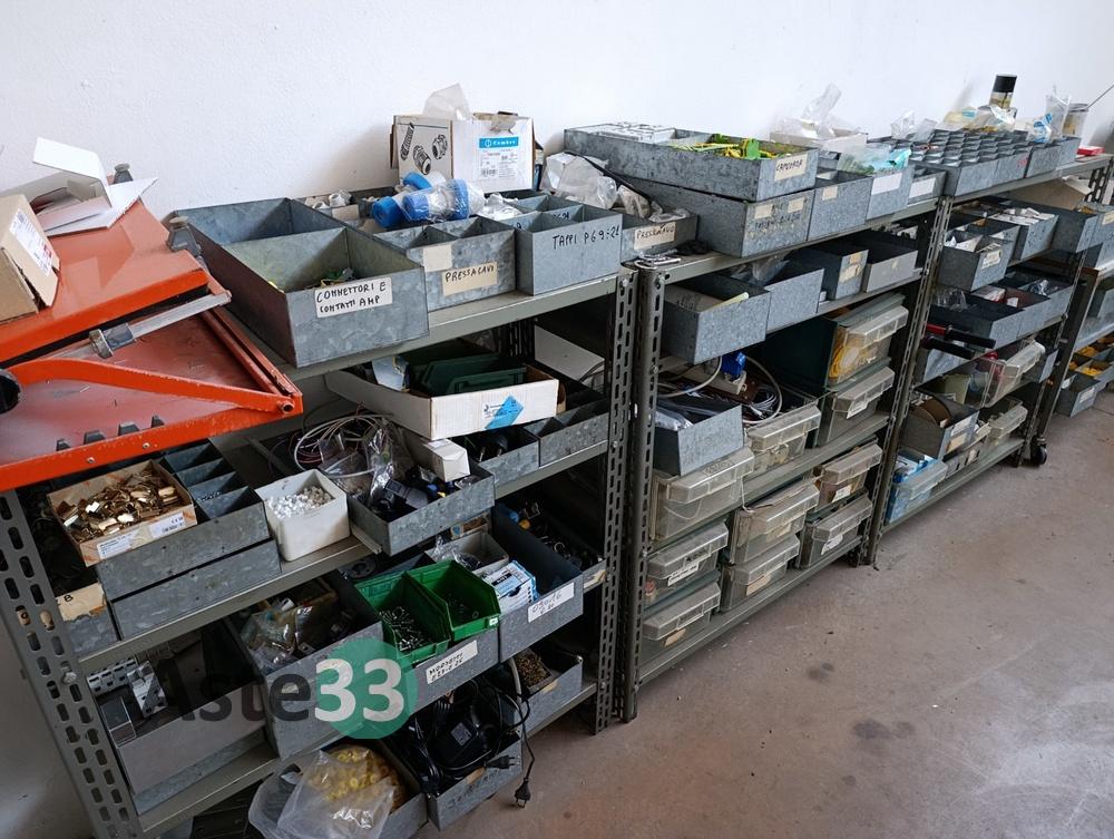 N.3 scaffali metallici leggeri, dimensioni 100x50cm x h.113cm, con 4 ripiani contenenti: minuterie elettriche, capicorda, pressacavi, raccordi pneumatici, prese elettriche, fusibili, morsettiere e interruttori automatici;