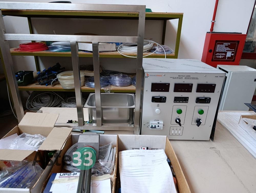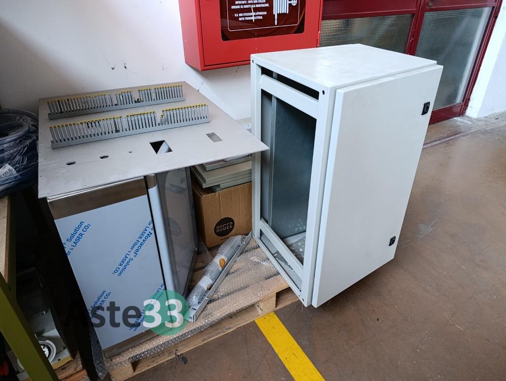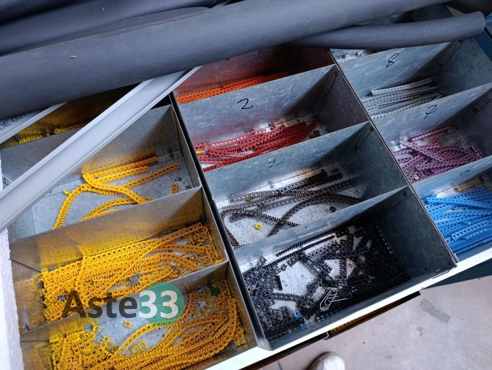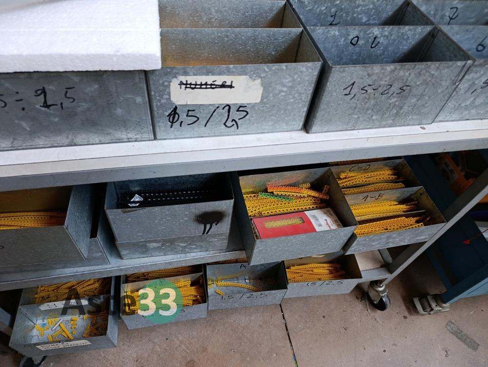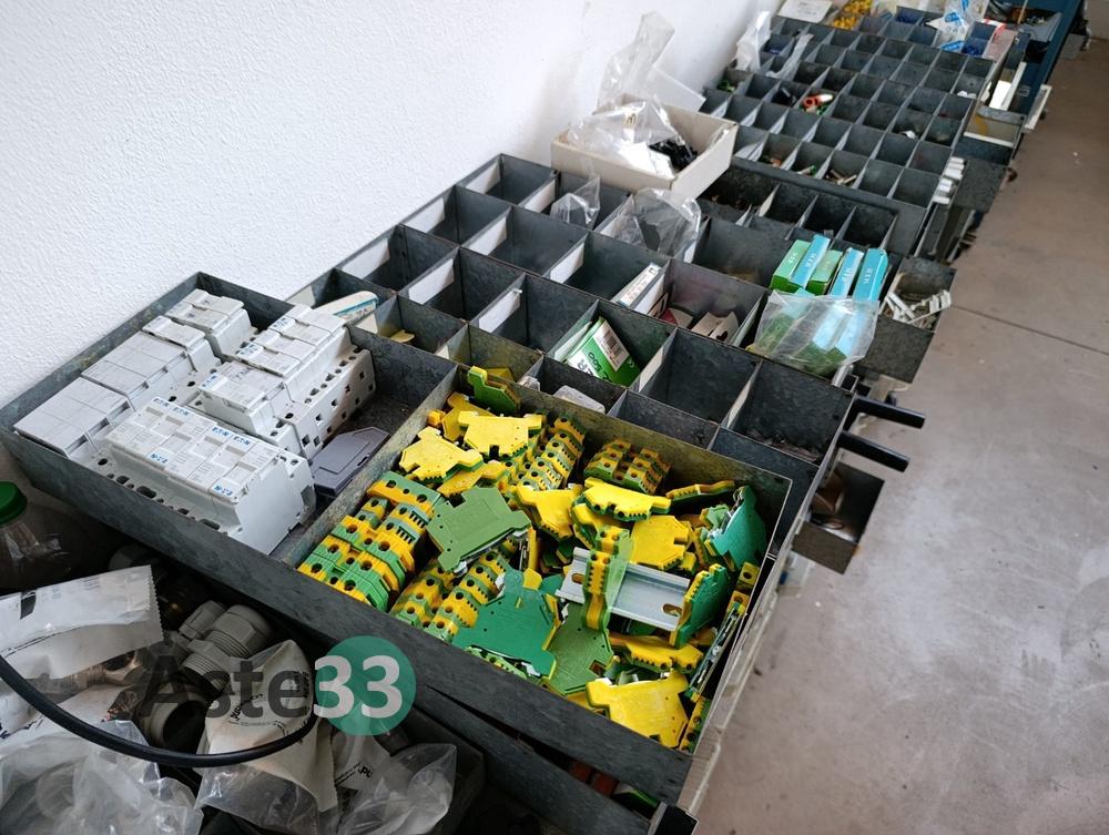N.3 scaffali metallici leggeri, dimensioni 100x50cm x h.113cm, con 4 ripiani contenenti: minuterie elettriche, capicorda, pressacavi, raccordi pneumatici, prese elettriche, fusibili, morsettiere e interruttori automatici;