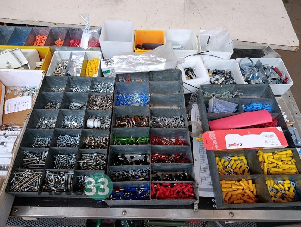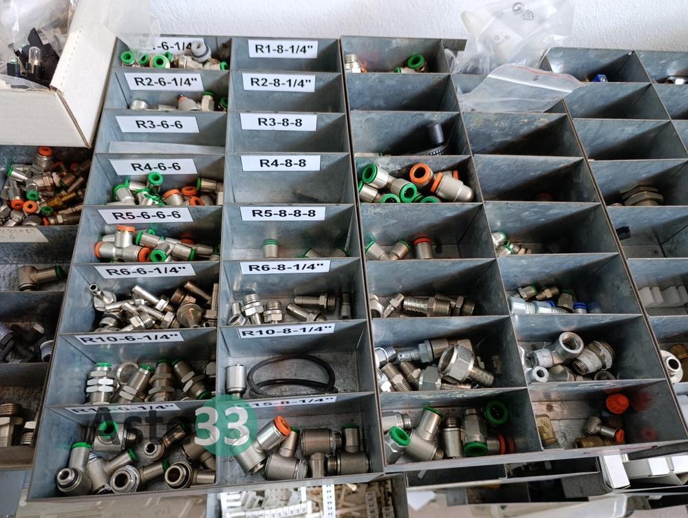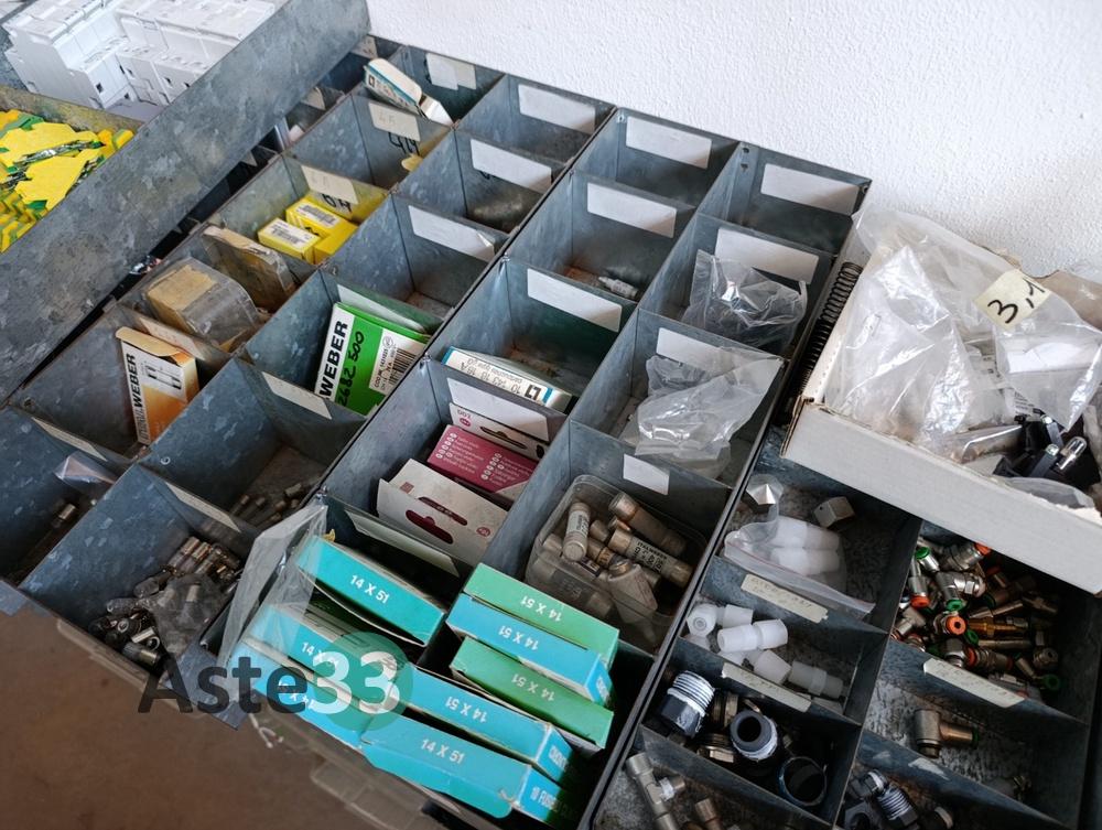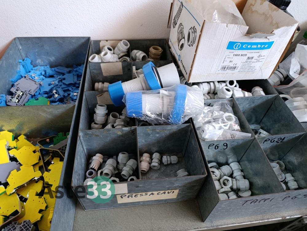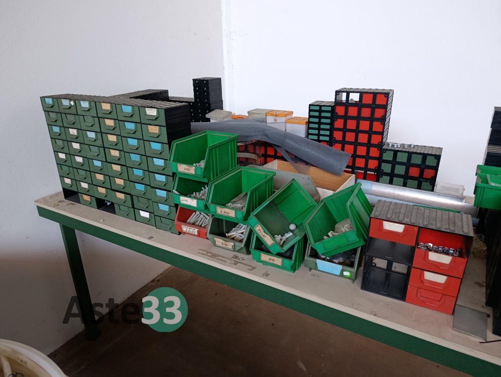 Vari contenitori in plastica contenenti raccorderia, minuteria metallica e minuteria in plastica;