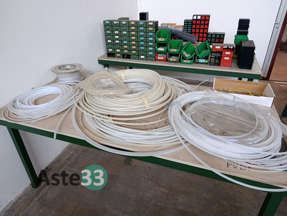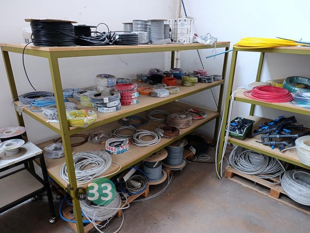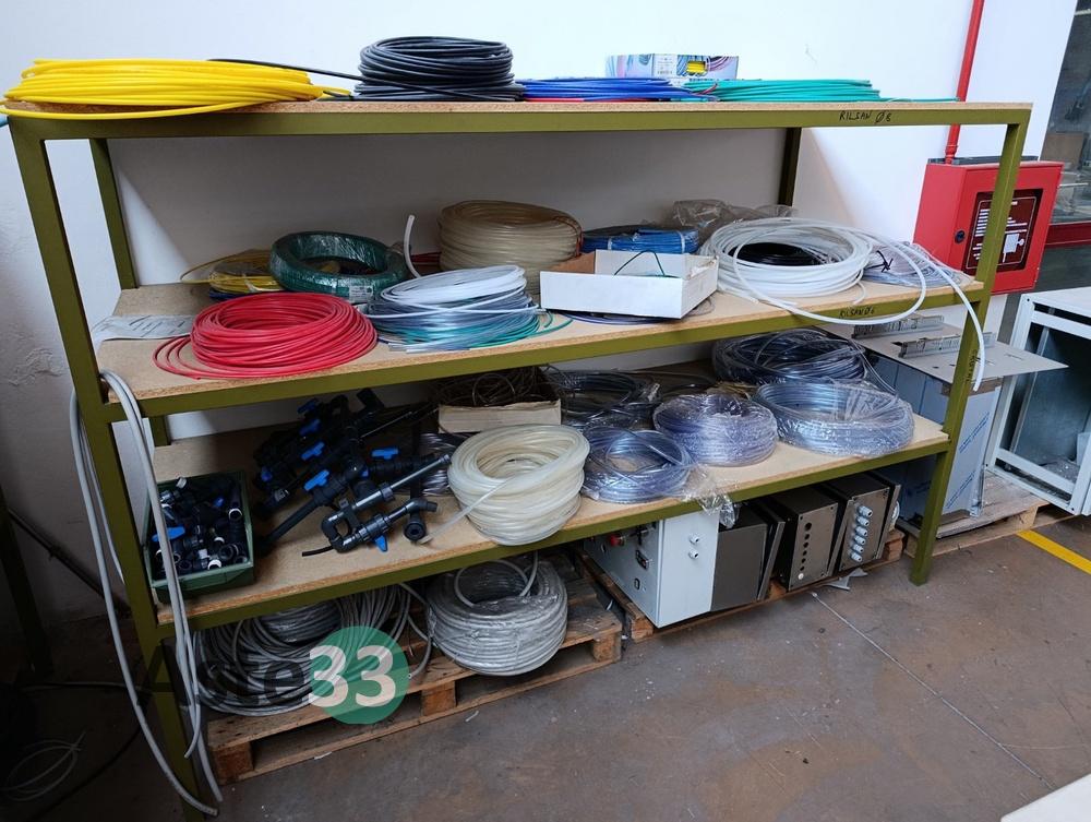 N.2 scaffali metallici, dimensioni 240x100cm x h. 165cm, contenenti: tubo pneumatico, tubo in gomma, filo elettrico e guaine di varie misure;