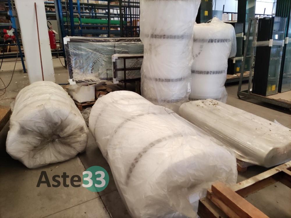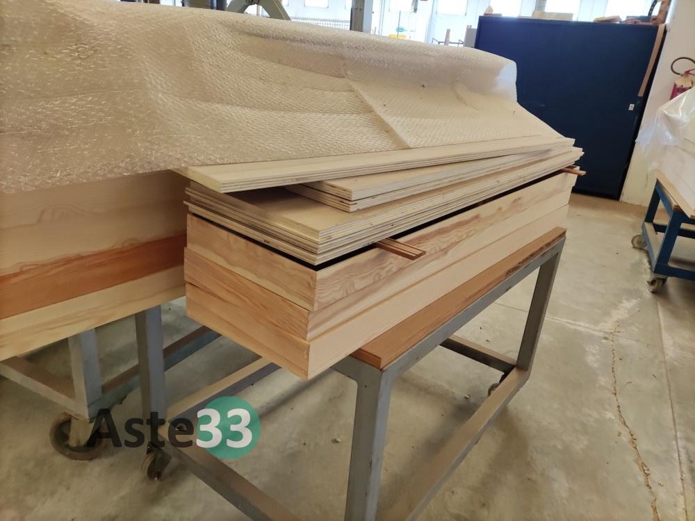 N. 37 cassonetti in legno semilavorato, con relativo coperchio;N. 210 circa di vetri per finestre, a doppio e triplo vetro, in sorte nei modelli e misure;N. 47 tavole in legno di pino (dimensioni di circa m. 3,90x0,15x0,04);N. 4 rotoli di pluriball;N. 3 strutture in alluminio per finestre;N. 29 strutture in alluminio per finestre;N. 3 monitor Samsung LED 24...