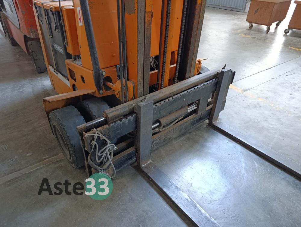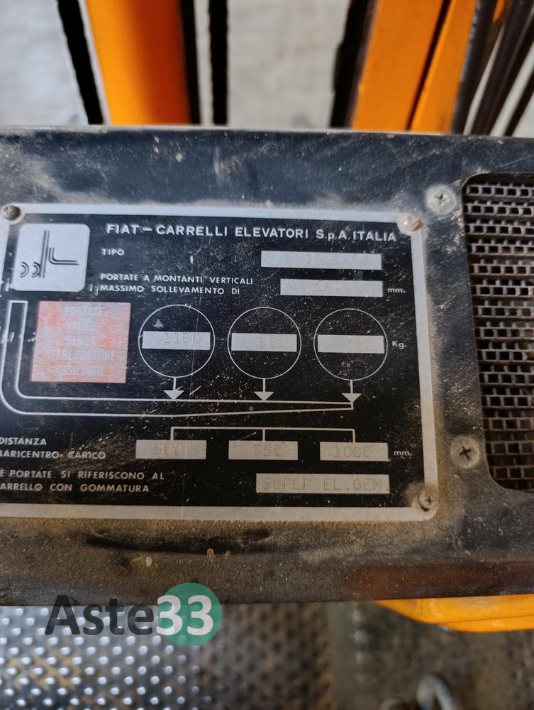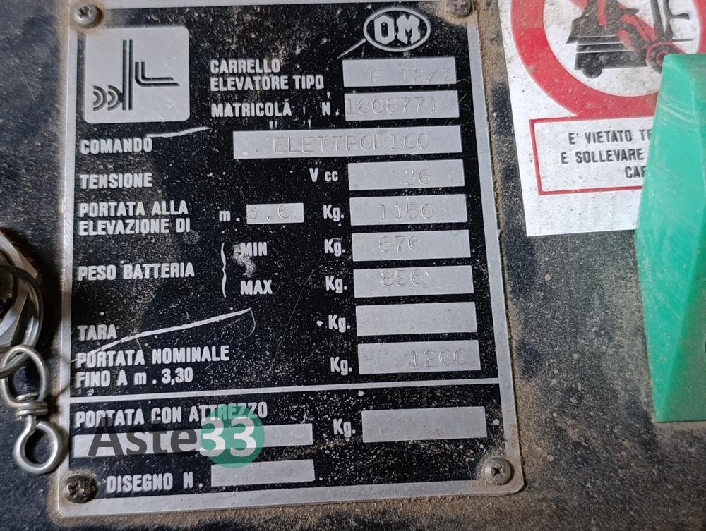 Carrello elevatore elettrico, marca OM, carrello tipo E 12/3, matricola 1808771, portata alla elevazione di 3,6mt kg 1.150, portata nominale fino a 3,3 mt 1200 kg (2.758 ore), completo di carica batterie.