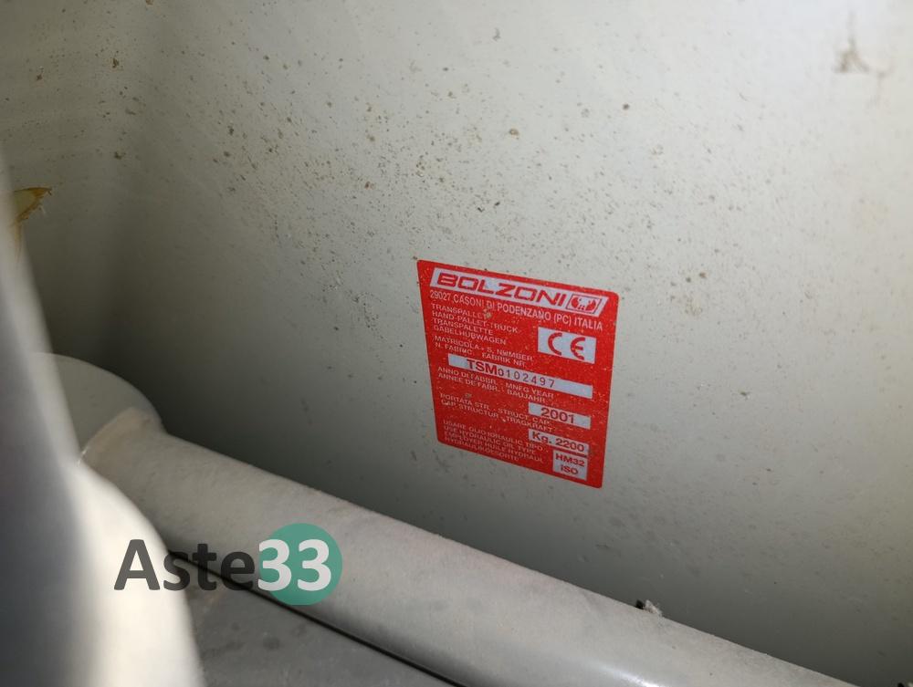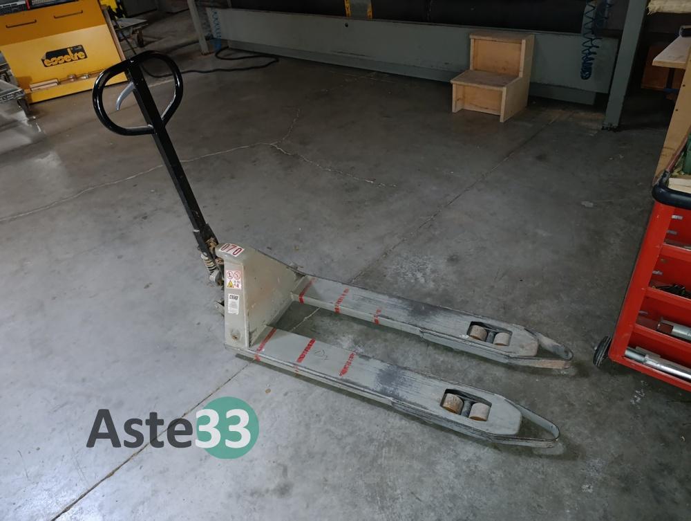 Transpallet manuale con forche di larghezza 90 cm; Transpallet manuale ATI, matricola TSM0102496;Transpallet manuale ATI, matricola TSM0102497.