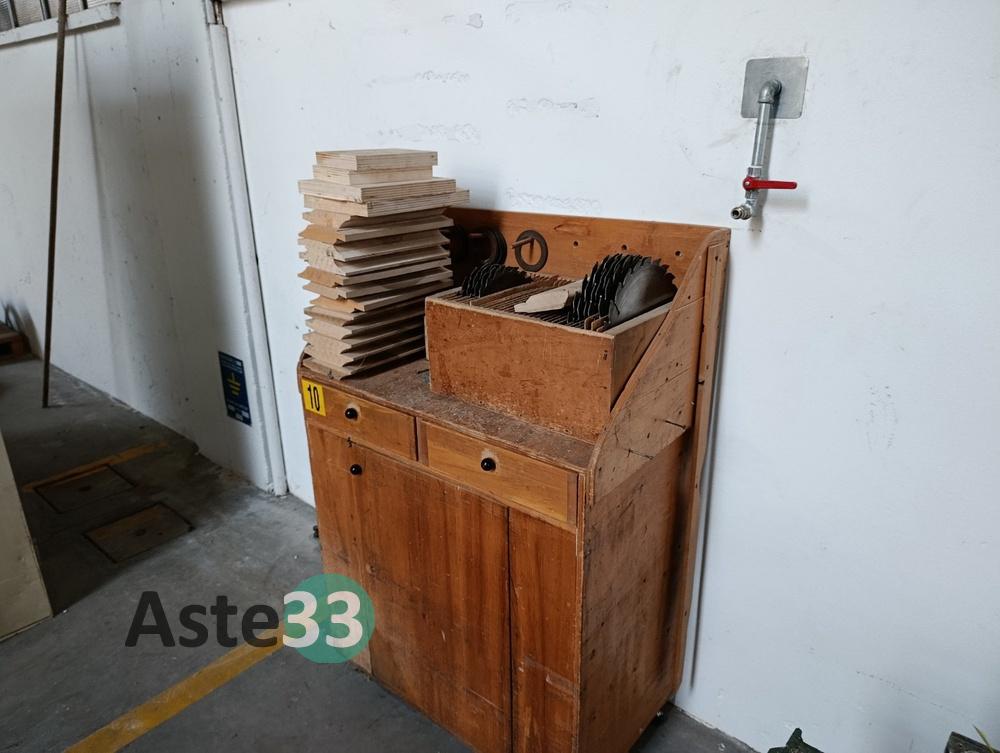 Mobiletto in legno con 1 anta e 2 cassetti;Macchina multilame marca COSMEC completa di cabina insonorizzante.
