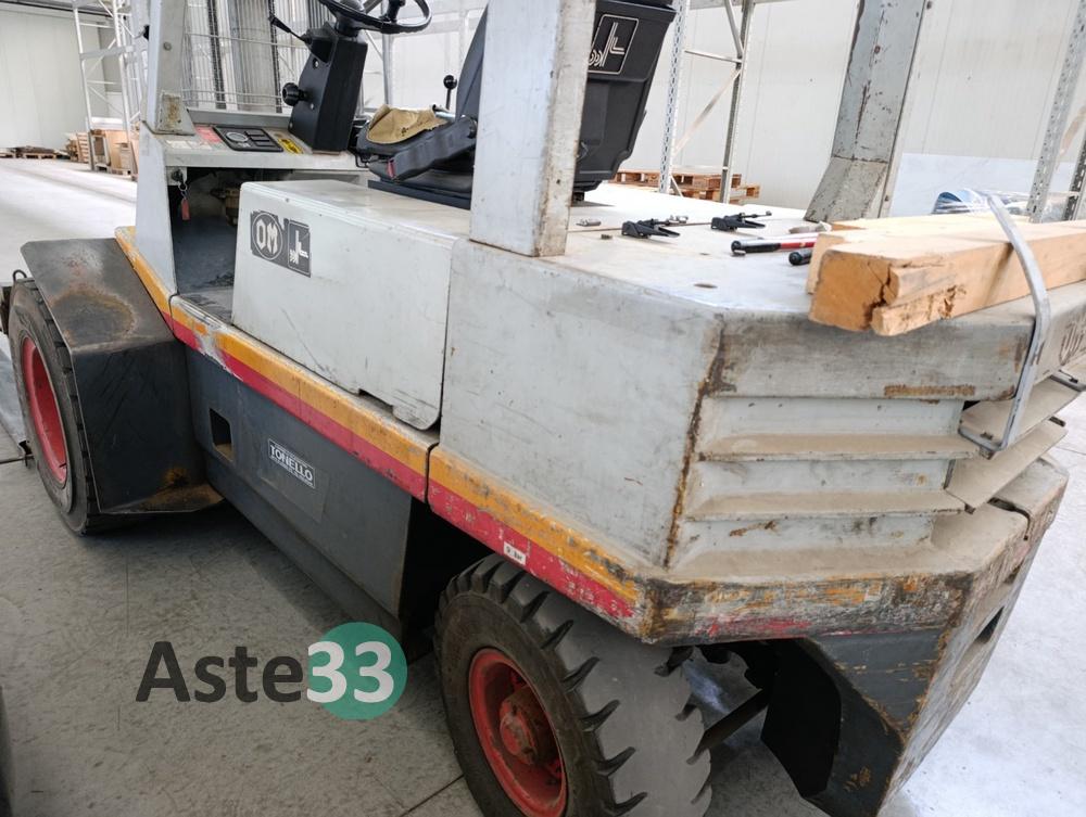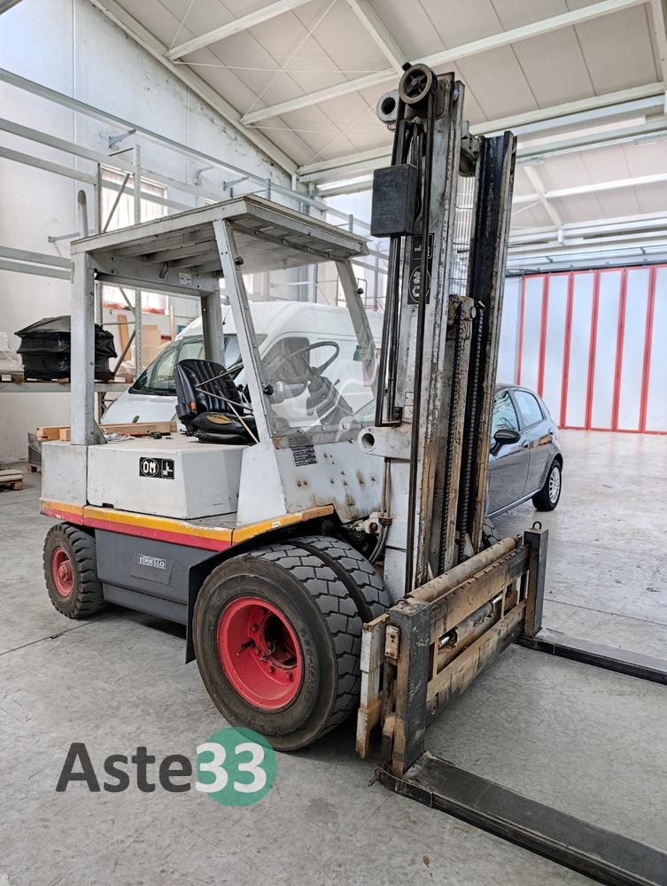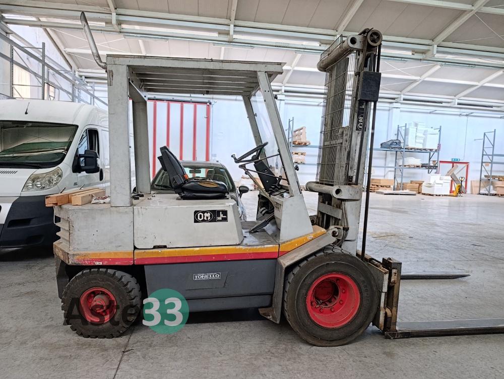 Carrello elevatore a gasolio, marca FIAT, mod. DI 35 C, matricola 1152022, anno 1982, portata nominale 3.500 kg, altezza sollevamento 4 mt.
