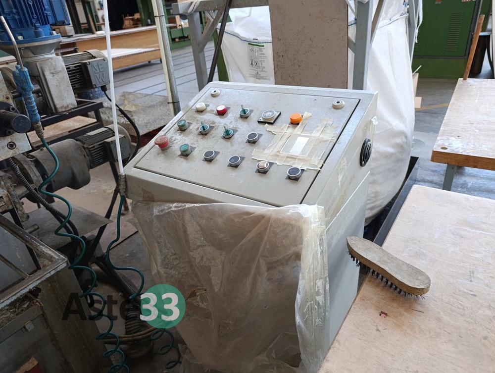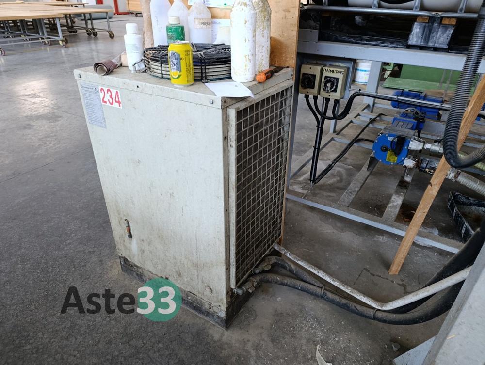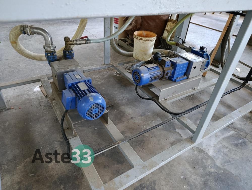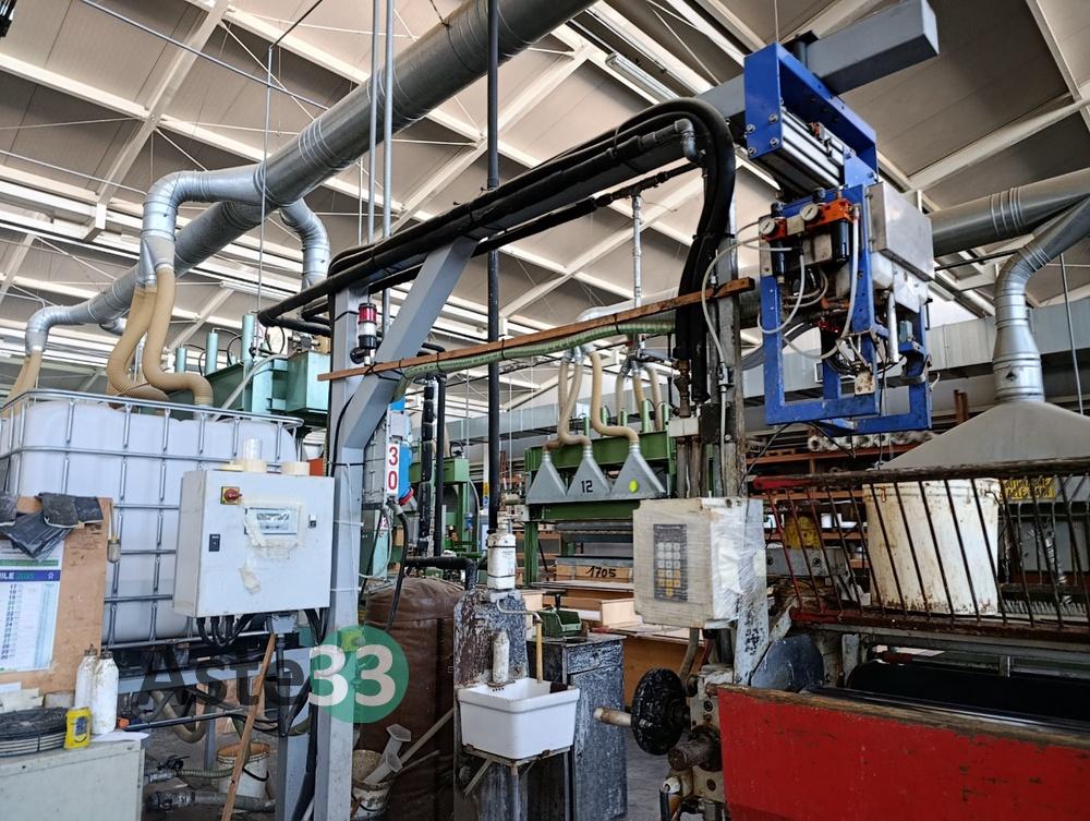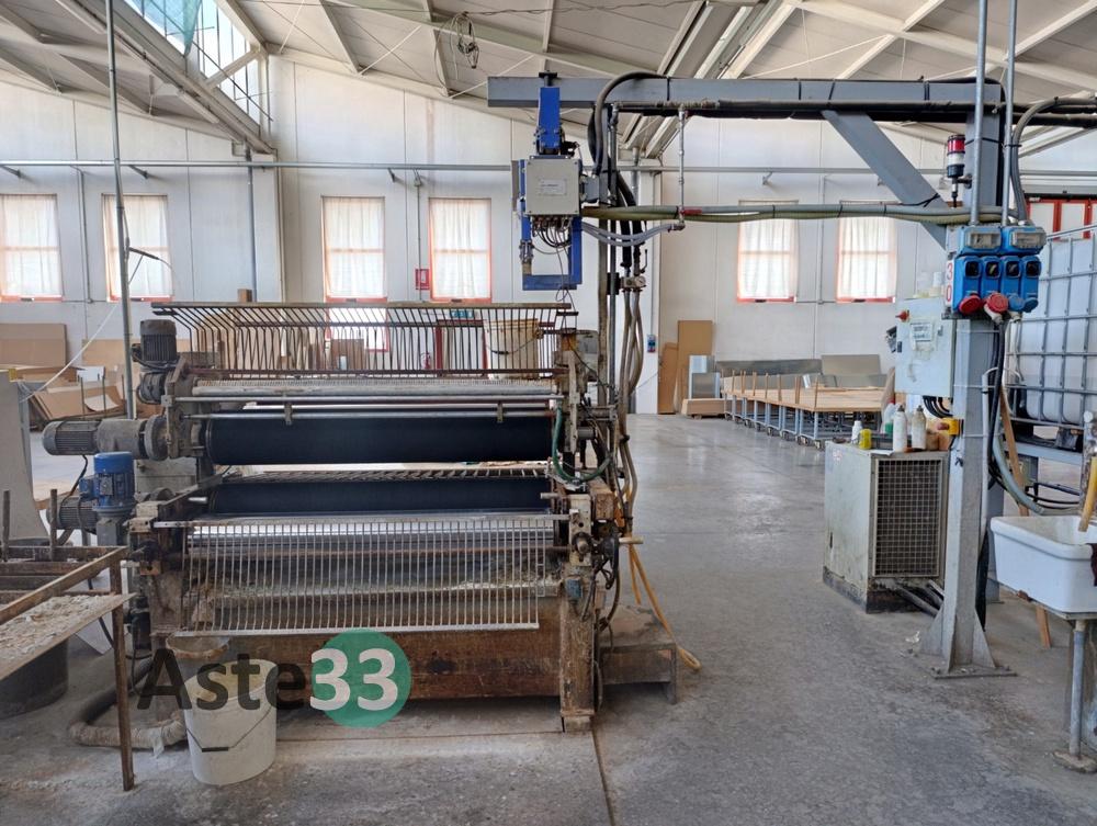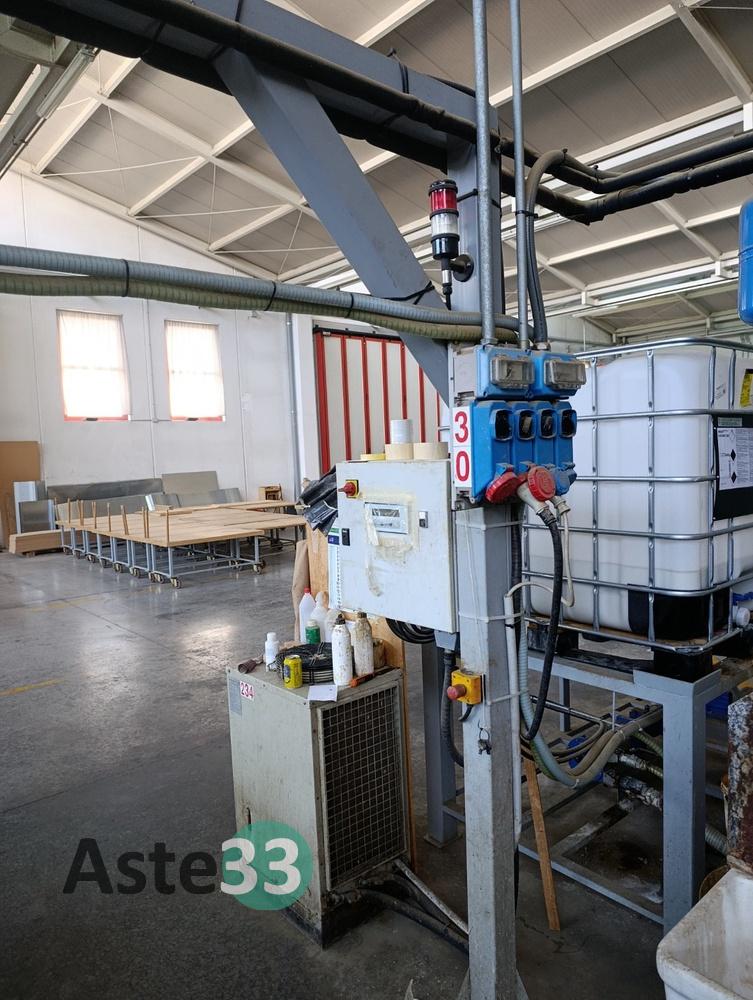 Impianto di spalmatura e distribuzione colla composto da: macchina spalma colla a rulli OMMA (modello OPEN 1300, anno 1995), dosatore collante (AKZO NOBEL, tipo G2OI-15-3000, n. seriale 13756, anno 2005), impianto refrigerante OMMA CRIO 28.00 2004, struttura metallica porta cisterne per collante con pompe e serbatoio SILE (anno 1999, capacità 200l);