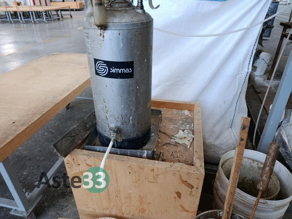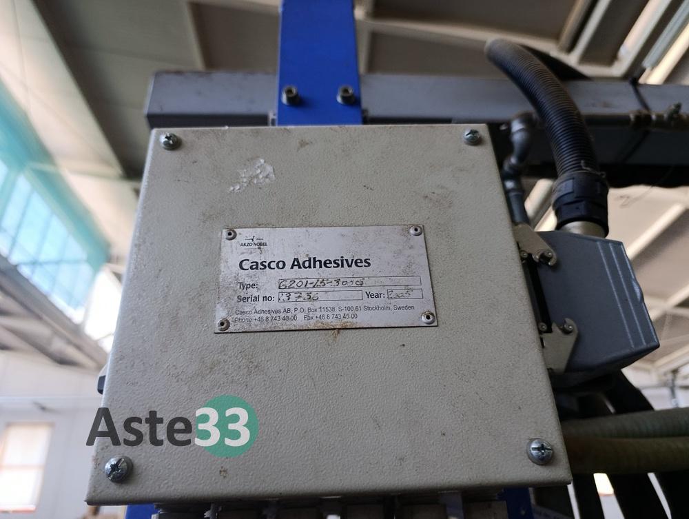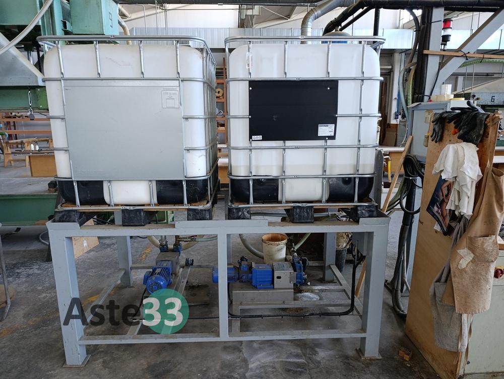 Impianto di spalmatura e distribuzione colla composto da: macchina spalma colla a rulli OMMA (modello OPEN 1300, anno 1995), dosatore collante (AKZO NOBEL, tipo G2OI-15-3000, n. seriale 13756, anno 2005), impianto refrigerante OMMA CRIO 28.00 2004, struttura metallica porta cisterne per collante con pompe e serbatoio SILE (anno 1999, capacità 200l);Serbatoio per collante;Carrello con 2...