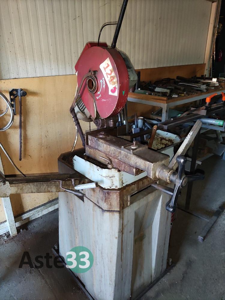 Trapano a colonna Famup, doppia mola, troncatrice Fabris, affilatrice, lapidello, varie frese e lame