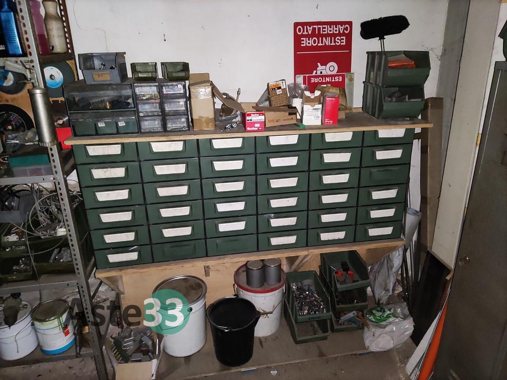 N.4 moduli di scaffalatura metallica leggera a più ripiani contenenti: ricambistica elettrica ed idraulica, accessori per saldatura e smerigliatura;