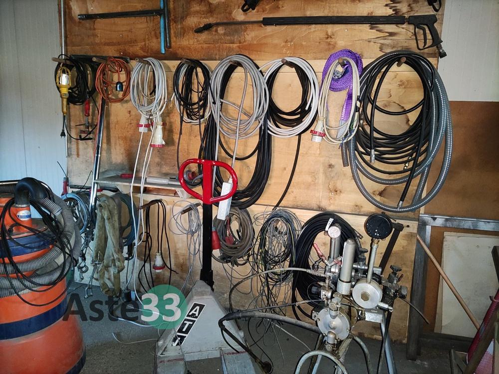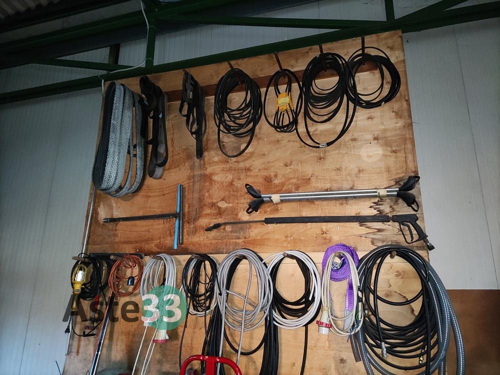 Pannello in legno a muro contenente: cinghie, tubazioni e prolunghe elettriche;