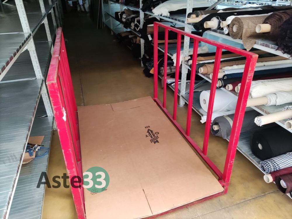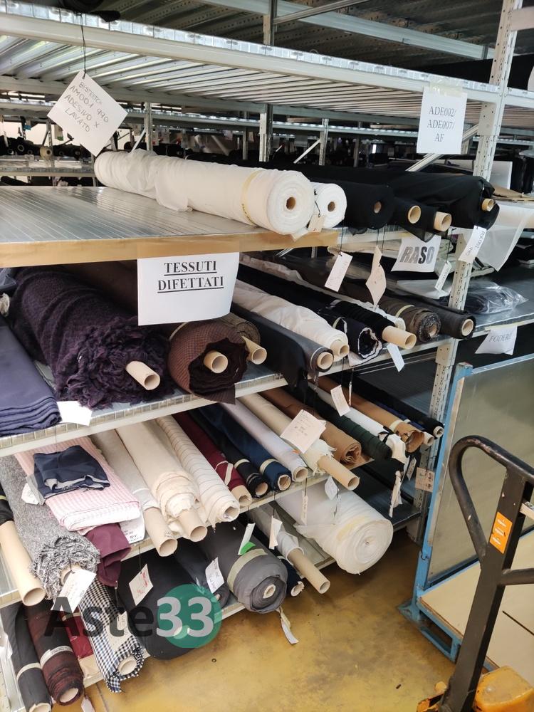 Circa mt. Lineari 14.430 di tessuti in sorte nella tipologia, dimensione e coloreria;Circa mt. Lineari 4.700 di fodere in sorte nella tipologia, dimensione e coloreria;N. 4 ceste metalliche per trasporto tessuti.