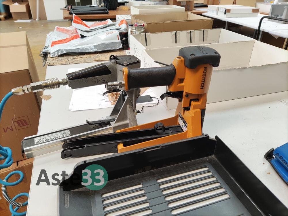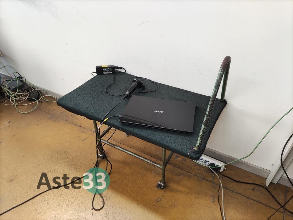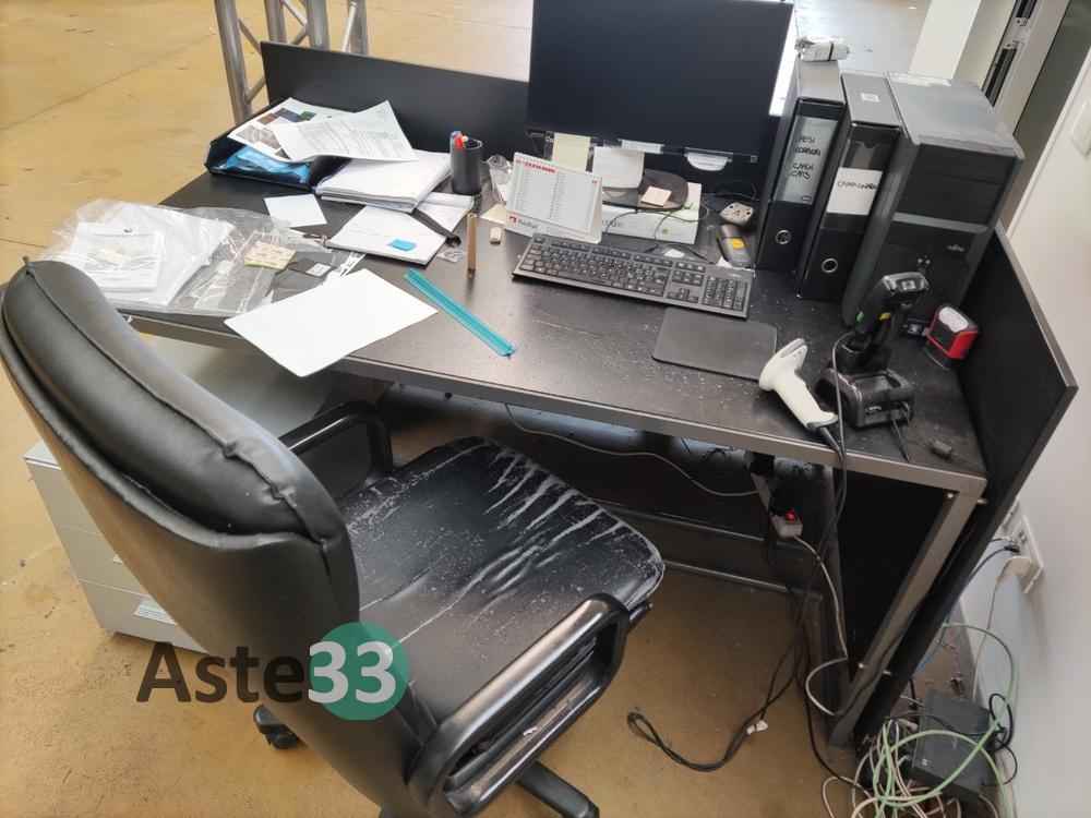 Arredamento per zona produzione, bilancia, manichini e mezzi busti, carrelli, banchi, postazione pc e bancali con imballaggi e rotoli di carta micropuntatina