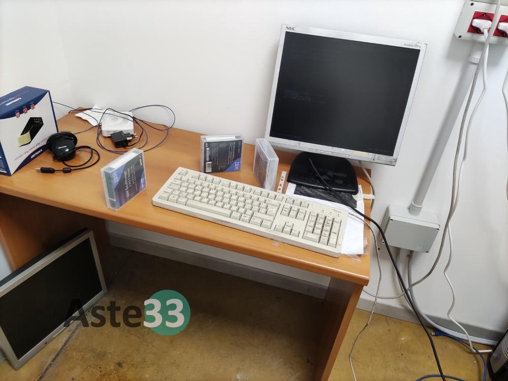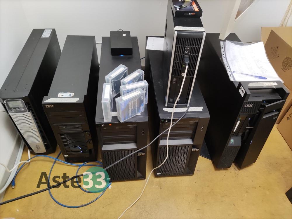 Sedia su ruote bianca;Scrivania;Monitor NEC con tastiera;Gruppo di continuità Riello UPS;Server IBM xSeries 226, sn. KDVMVX0;N. 2 server IBM System x3400;Server IBM 520, s.n. 65-9F2F2;Pc Fujitsu Esprimo, serial YL7P086466;Mobiletto rack contenente LinkStation BUFFALO e WD Elements Desktop;Mobiletto rack contenente multiswitch di rete.